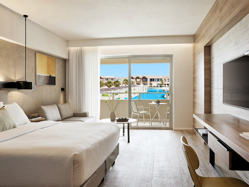 Bei den Blicken wählt Ihr zwischen Pool-, seitlichem oder direktem Meerblick; einige Einheiten bieten Sharing-Pool-Zugang. Juniorsuiten trennen Wohn- und Schlafbereich per Schiebetür. Familiensuiten verfügen über ein separates Schlafzimmer und ein zusätzliches Bad/Dusche. Suiten bieten einen separaten Wohn-/Schlafraum mit Verbindungstür. Highlight: Sharing-Pool-Optionen und Meerblickvarianten strukturieren die Auswahl klar.
