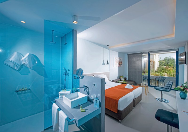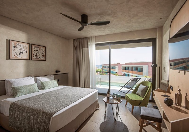 Balkon oder Terrasse öffnet den Blick, teils direkt aufs Meer. Besonderheit: Zimmer mit privatem, zentral beheiztem Pool sind verfügbar; alternativ teilt Ihr Poolzugang je nach Kategorie. Details wie USB-Ladepunkte und Außenmöbel runden das Profil ab. Highlight: Auswahl von Meerblick bis Privatpool, klar strukturiert.