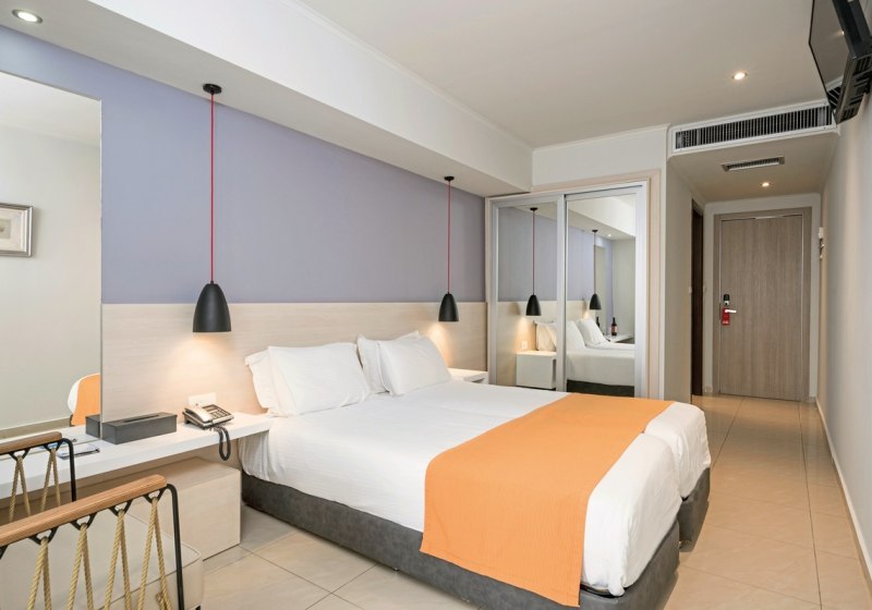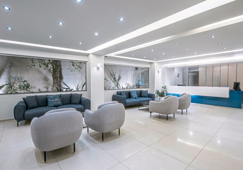 Das Haus ist überschaubar und gut organisiert: Lobby und 24-Stunden-Rezeption, Aufzug und durchgängiges WLAN. Am Pool sowie am Strand warten Liegestühle und Sonnenschirme; Badetücher erhaltet Ihr an der Rezeption gegen Gebühr. Die Poolanlage im Corissia Park steht Euch zusätzlich offen.