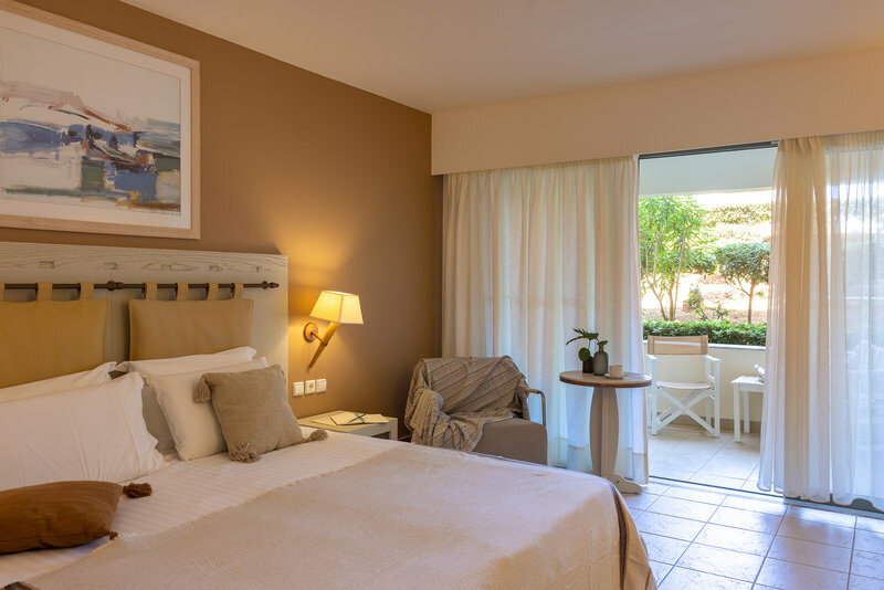 Die Zimmer des Giannoulis Santa Marina Plaza, alle mit Meerblick, sind modern und komfortabel eingerichtet und verfügen über eine Vielzahl von Annehmlichkeiten, dazu zählen unter anderem Bad/WC, Bademäntel, Föhn, Kaffee-/Teezubereiter, Sat.-TV, eine Sitzecke, Slipper, Telefon und eine terrasse mit Möbeln. WLAN ist in allen Zimmern kostenlos verfügbar und die Klimaanlage ist individuell regulierbar. Die Minibar und der Roomservice sind gegen Gebühr erhältlich.