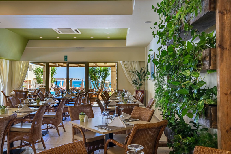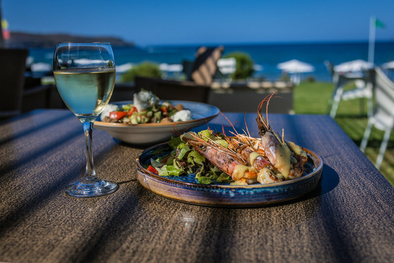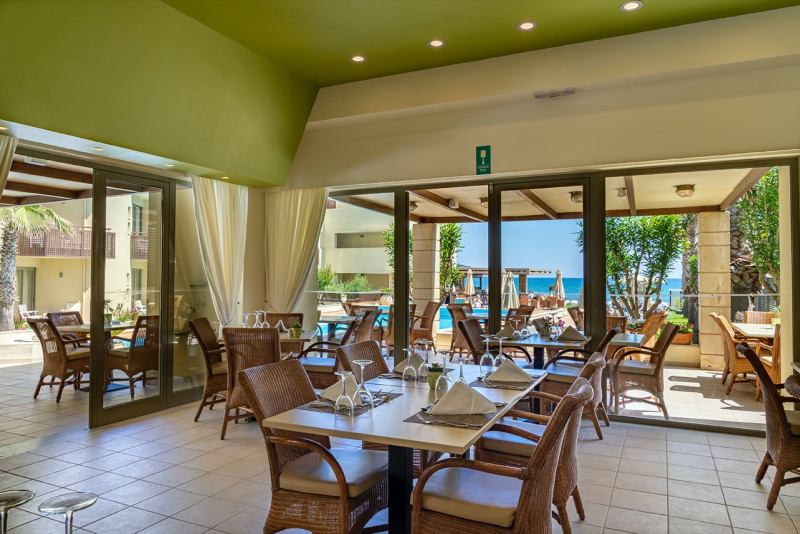Das Giannoulis Santa Marina Plaza verfügt über ein Hauptbuffetrestaurant und ein À-la-carte-Restaurant 'Azzuro'. Über diese hinaus stehen den Gästen zwei Bars zur Verfügung: eine Poolbar, die auch als Snackbar genutzt werden kann, und eine Lobbybar. Die Küche bietet Gerichte und Menüs mit internationalem, mediterranem und regionalem Einfluss an. Die Verpflegungsleistung beinhaltet Halbpension, bestehend aus Frühstück und Abendessen (Buffetform) mit Showcooking und Themenbuffets.