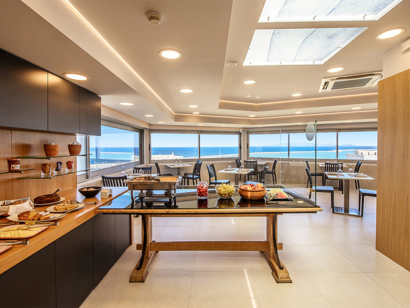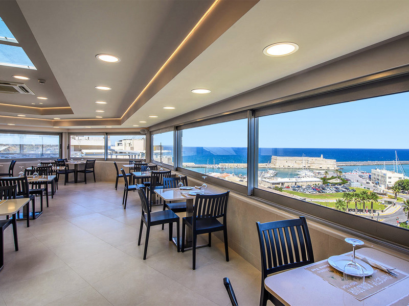 Marin Hotel ist ein urbanes City- und Businesshotel im Zentrum von Heraklion. Hier wohnt Ihr mitten im Geschehen, mit Blickachsen auf Hafen und die venezianische Festung. Die Atmosphäre wirkt klar strukturiert, funktional und komfortorientiert – ideal, wenn Ihr konzentriert tagen, effizient arbeiten oder kompakt die Stadt erkunden wollt. Der Tag beginnt über den Dächern: Auf der Dachterrasse erwartet Euch das Frühstücksrestaurant mit weitem Panorama.
