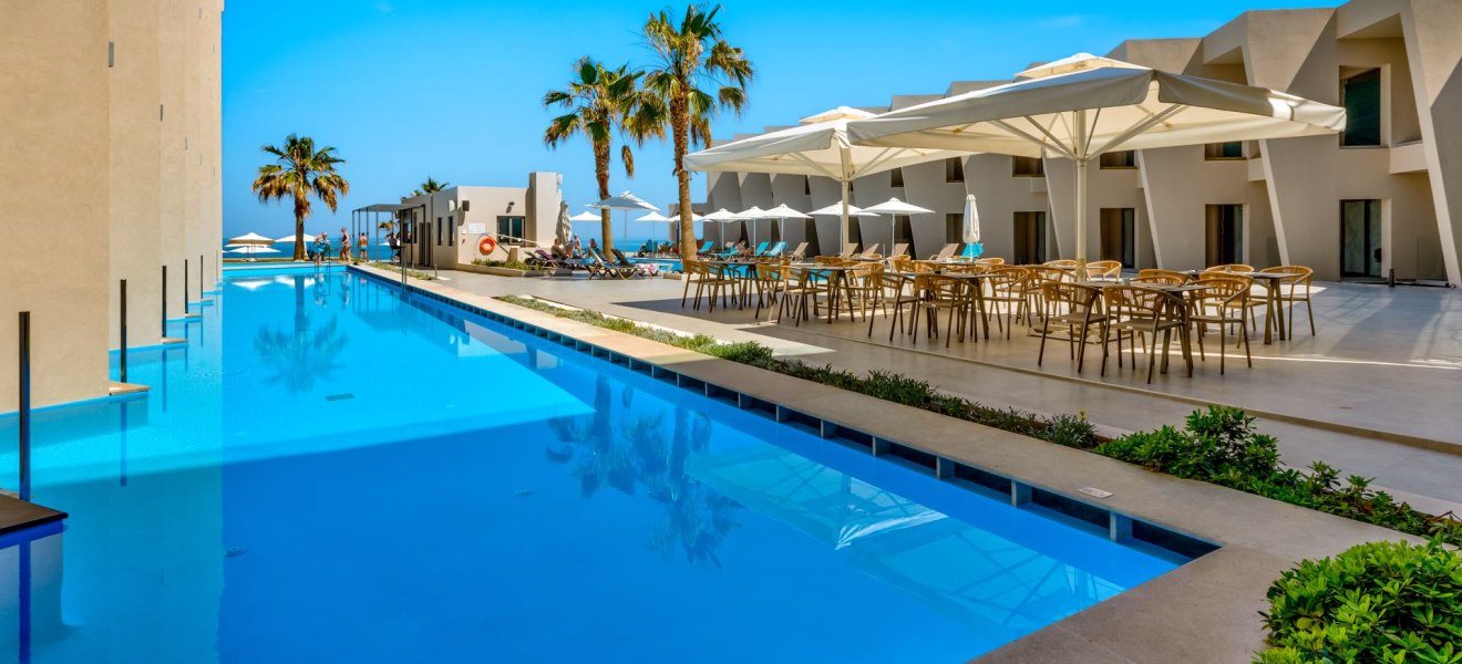 White Olive Elite Rethymno verbindet direkte Meerlage, Renovierung von 2021 und klare Servicestrukturen. Die Wege sind kurz, die Angebote fokussiert: zwei Pools, Kinderbereiche, All-Inclusive-Verpflegung mit Live-Kochen und ein kompaktes Spa. So entsteht ein stringentes Setup für entspannte Strandtage.