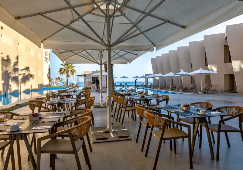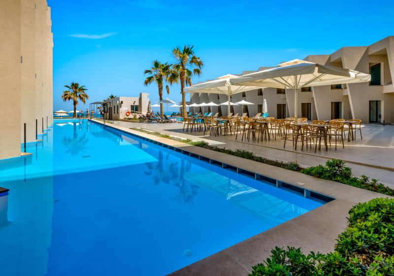 Die Infrastruktur ist auf entspannte Strandtage ausgelegt: 24-Stunden-Rezeption, Lobby und eine Lounge mit Terrasse strukturieren den Empfang und die Wege. Zwei Swimmingpools, Sonnenterrassen sowie Liegen und Schirme am Pool und am Strand bilden die ruhige Kulisse Eurer Auszeit.