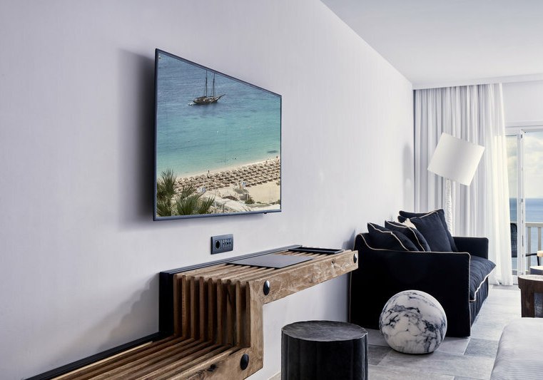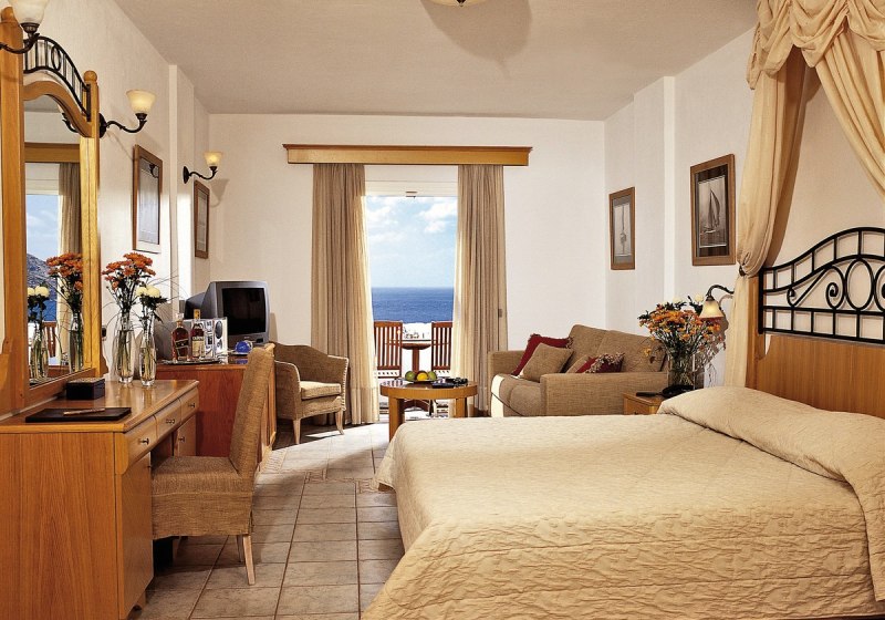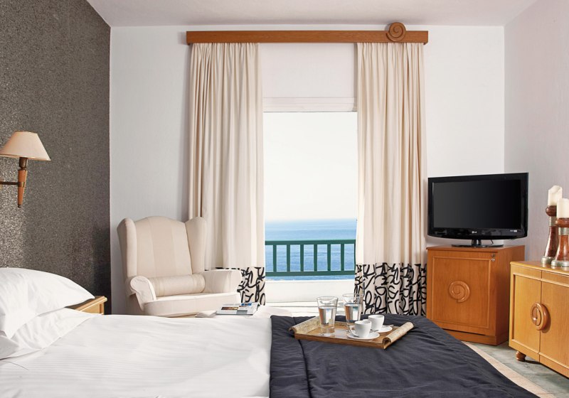 Die Zimmer wirken aufgeräumt und wertig ausgestattet. Ihr wohnt auf 26 bis 35 Quadratmetern, je nach Kategorie mit Meerblick. Balkon oder Terrasse öffnen den Außenraum, die Hanglage gibt Tiefe. Dusche oder Badewanne, Bademantel, Slipper und Föhn gehören ebenso dazu wie Klimaanlage, Safe, Sat-TV und kostenpflichtige Minibar.