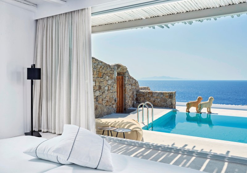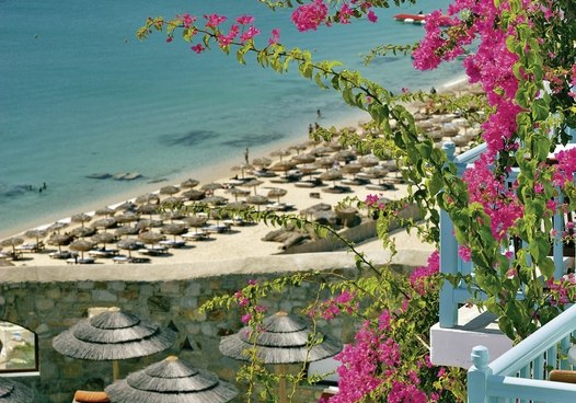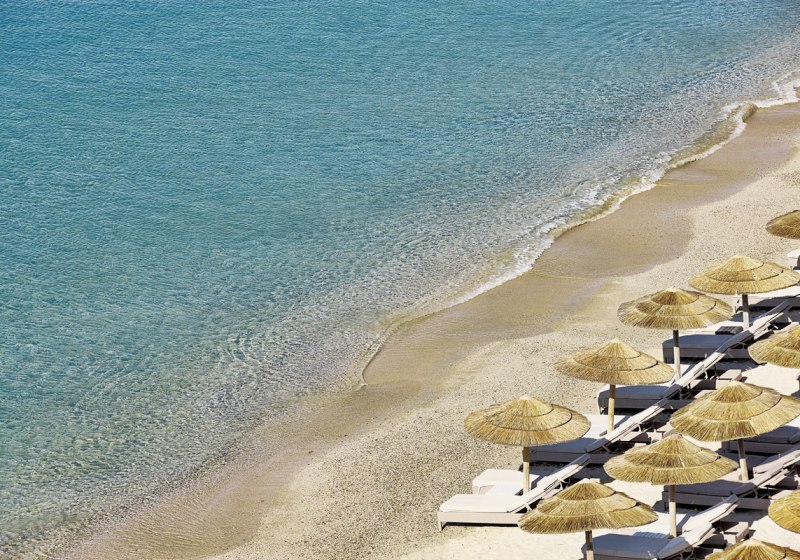 Die Kulisse stimmt: Hanglage an einer Privatbucht, etwa 200 Meter bis zum Sandstrand, rund 12 Kilometer bis nach Mykonos-Stadt. So bleibt Ihr nah am Wasser und zugleich fern vom Trubel des Zentrums. Der Weg zum Strand ist kurz, vor Ort erwarten Euch Liegen, Badetücher und – laut Ausstattung – Sonnenschirme. Das Meer ist Euer Fixpunkt, die Terrassen und Pools staffeln sich darüber. Mit hoteleigenem Shuttleservice und Mietwagenverleih bleibt Ihr flexibel, ob für Restaurantbesuche in der Umgebung oder Ausflüge nach Mykonos-Stadt. Die Lage richtet den Blick auf das Wasser und hält den Alltag auf Abstand, ohne die Inselanbindung zu verlieren. Highlight: Privatbucht mit überschaubarer Distanz zum Sandstrand für den direkten Start in Euren Strandtag.