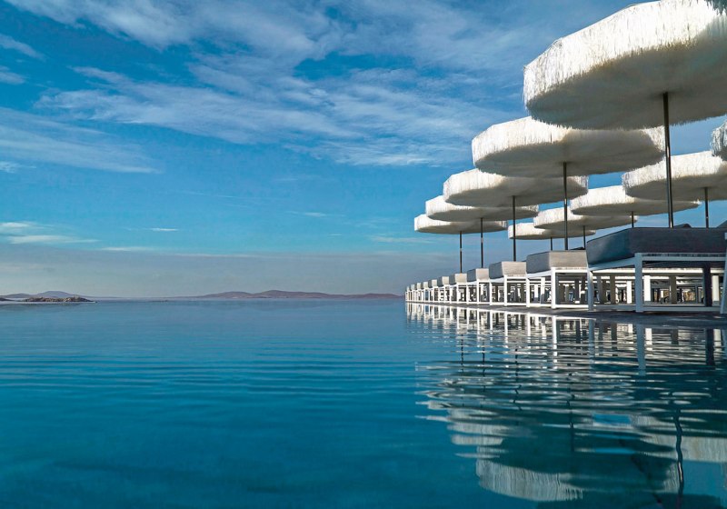 - Infinity-Pool: Beheizter 200-Quadratmeter-Pool mit Liegen und Schirmen am Wasser.