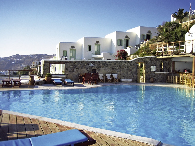 Im Mykonos View Hotel wohnt Ihr in einem Hotel im kubischen Stil, das sich in Hanglage über Mykonos erhebt. Die kompakte Anlage setzt auf regionale Baustoffe und wirkt dadurch stimmig und bodenständig. WLAN begleitet Euch in allen Bereichen, die Sonnenterrasse öffnet den Blick, und der Außenpool wird zum ruhigen Treffpunkt nach Stadtbummeln.