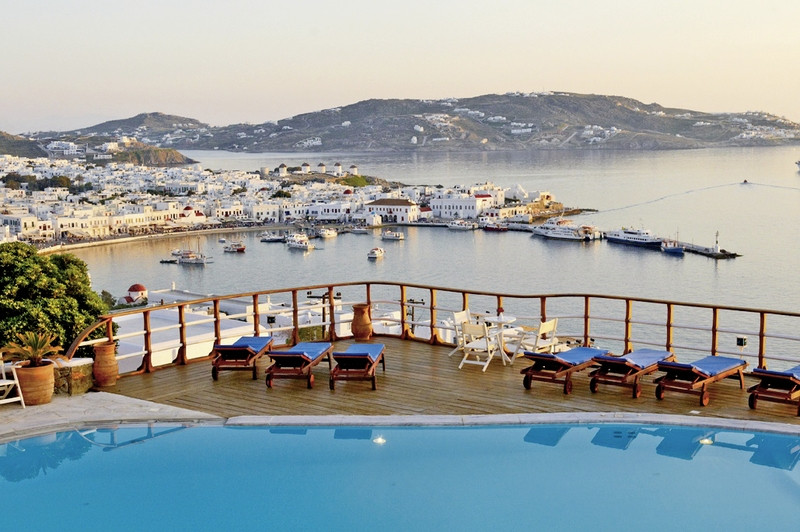 Mykonos View Hotel vereint kubische Architektur, Hanglage und kurze Wege in die Stadt. Der Außenpool mit Sonnenterrasse strukturiert ruhige Stunden, während Kinderbetreuung und Miniclub Familien entlasten. Kulinarisch überzeugt landestypische Küche, ergänzt um Frühstücksbuffet, Bar und Poolbar.