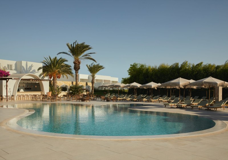 - Frisches Nass: Süßwasser-Außenpool mit bequemen Liegen und Schirmen.