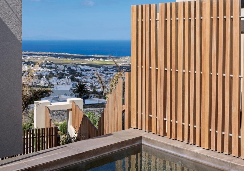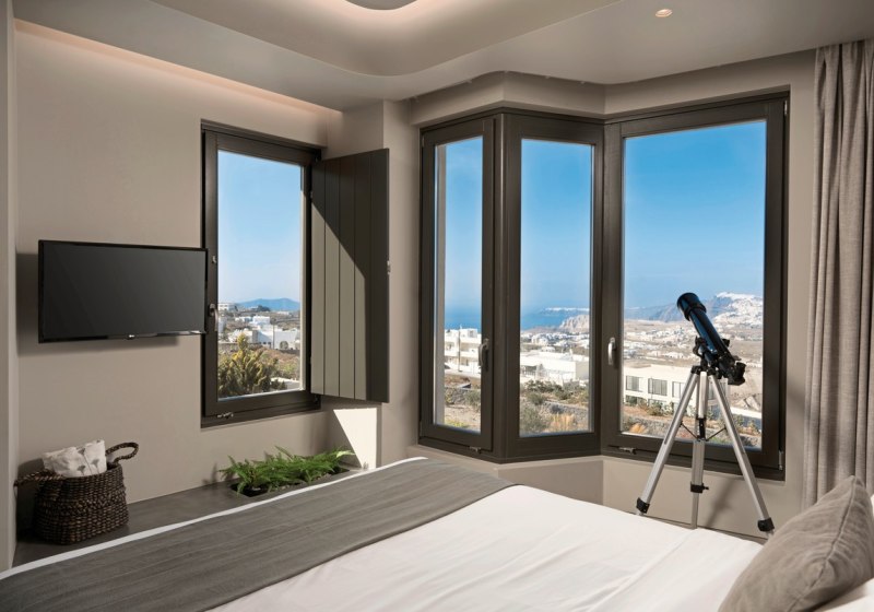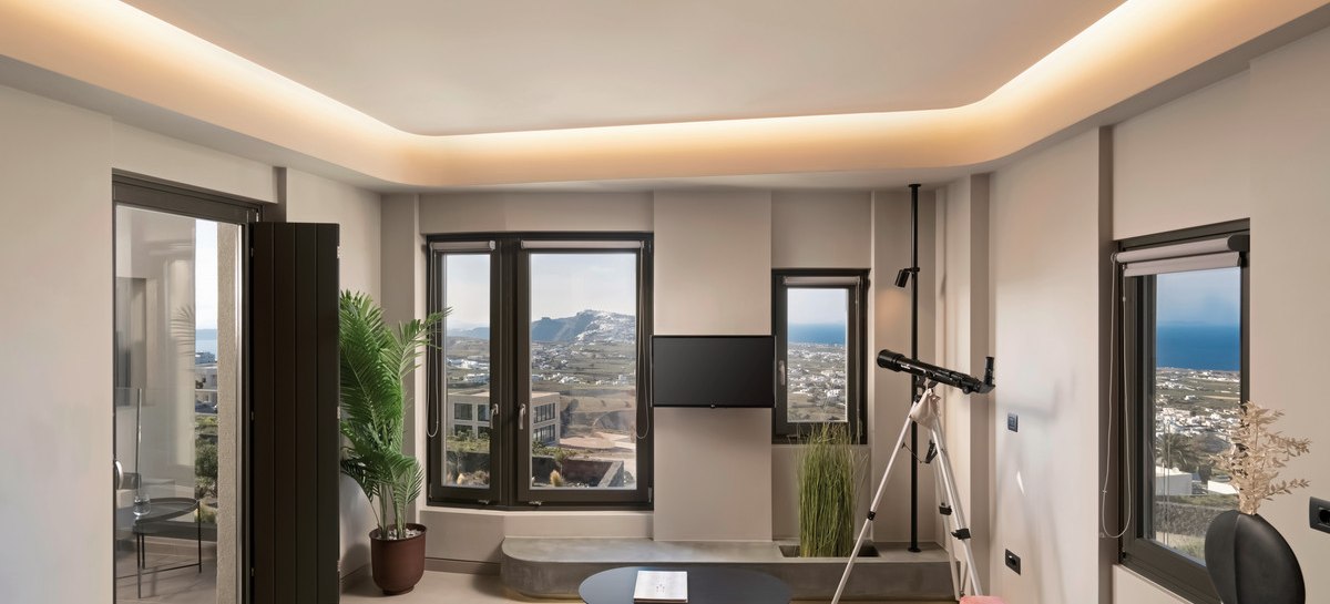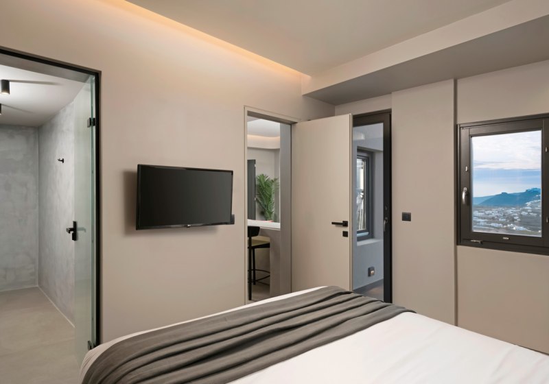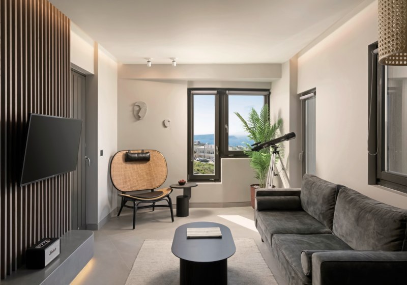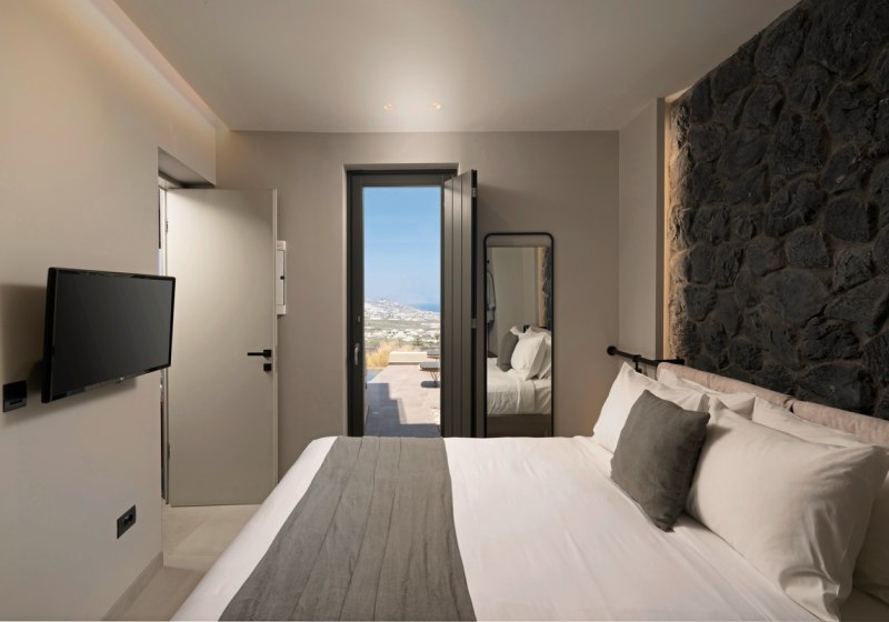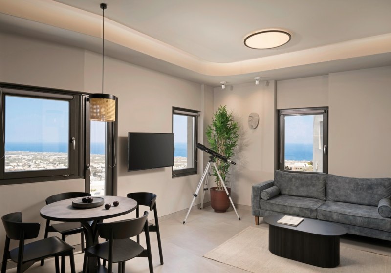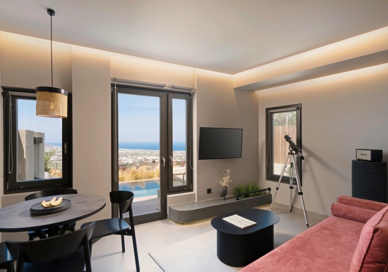 In Apikia Santorini wohnt Ihr in einem kleinen, feinen Rückzugsort mit nur 12 Suiten, offiziell mit 5 Sternen ausgezeichnet. Das Haus liegt im Dorf Pyrgos in ruhiger Lage und öffnet Euch weite Panoramablicke über Insel und Meer. Der Stil setzt auf private Räume, viel Tageslicht und Terrassen, die das Draußen zum Teil des Erlebnisses machen.