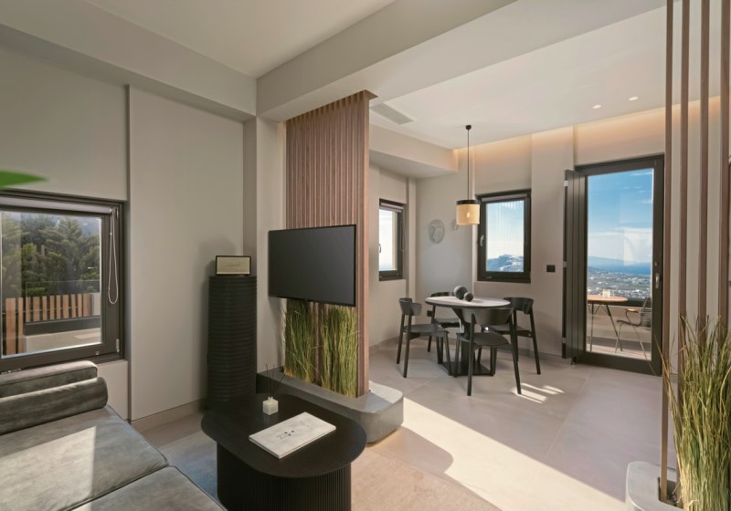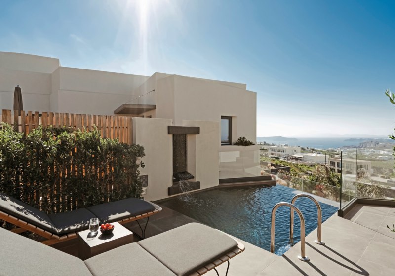12 Suiten bilden das Herz von Apikia Santorini. Viele öffnen sich zur Terrasse, einige bieten Whirlpool im Freien oder einen beheizbaren Privatpool. In ausgewählten Kategorien wohnt Ihr auf zwei Etagen; teils mit separatem Wohnraum, zwei Schlafzimmern und zwei Bädern – ideal, wenn Ihr Großzügigkeit und Struktur mögt.