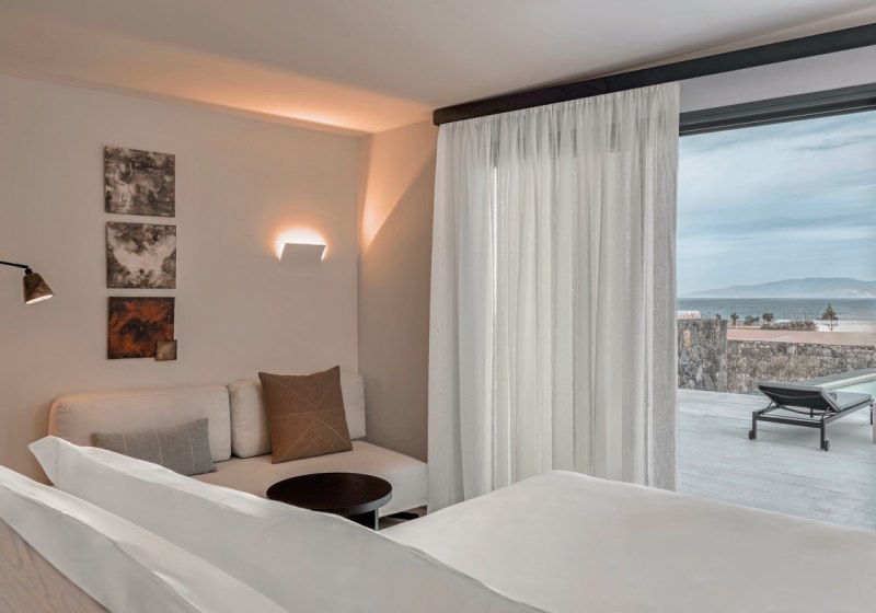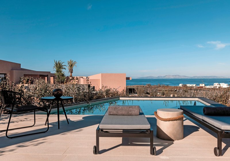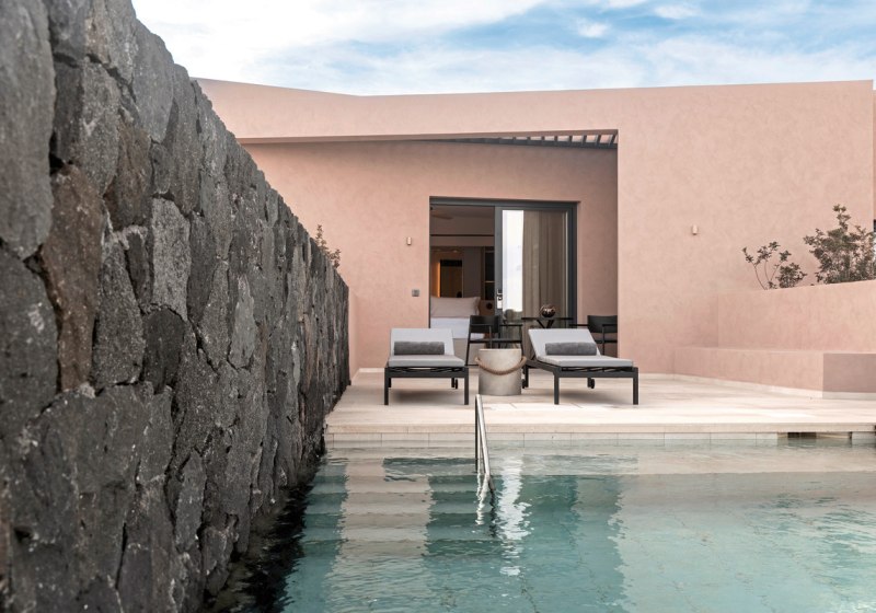 Im Aussenbereich erwartet Euch ein beheizbarer Süsswasserpool mit rund 120 Quadratmetern, umrahmt von Liegestühlen, Sonnenschirmen und Badetuchservice. Sonnenterrasse, Lounge, Liegewiese und Aussenmöbel schaffen klare Bereiche. Ein Hotelbus verbindet Euch bequem mit Oia; Parkplätze stehen zur Verfügung.