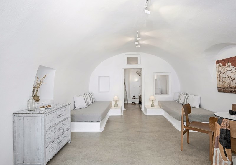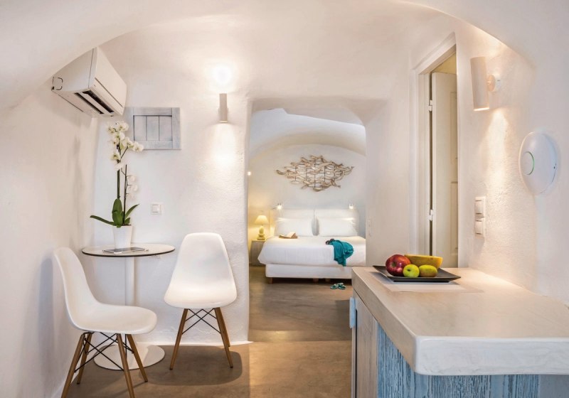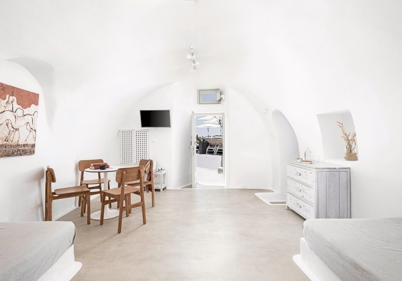 Für Euren Tagesrhythmus stehen Espressomaschine sowie Kaffee- und Teezubereiter bereit. Minibar (kostenpflichtig), Safe, Sat-TV, Telefon und WiFi ergänzen die Ausstattung. Mehrere Einheiten bieten Sitzecken oder getrennte Schlafzimmer. Dusche und durchdachtes Badkonzept halten die Linie klar. So entsteht ein Zimmererlebnis, das die Caldera-Perspektive bewusst in den Mittelpunkt stellt.