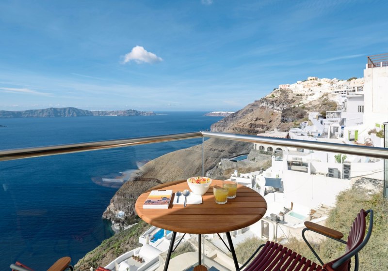 • Wohnen mit Blick: Balkon und Meerblick rücken die Caldera in den Mittelpunkt.
