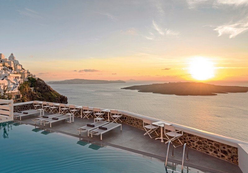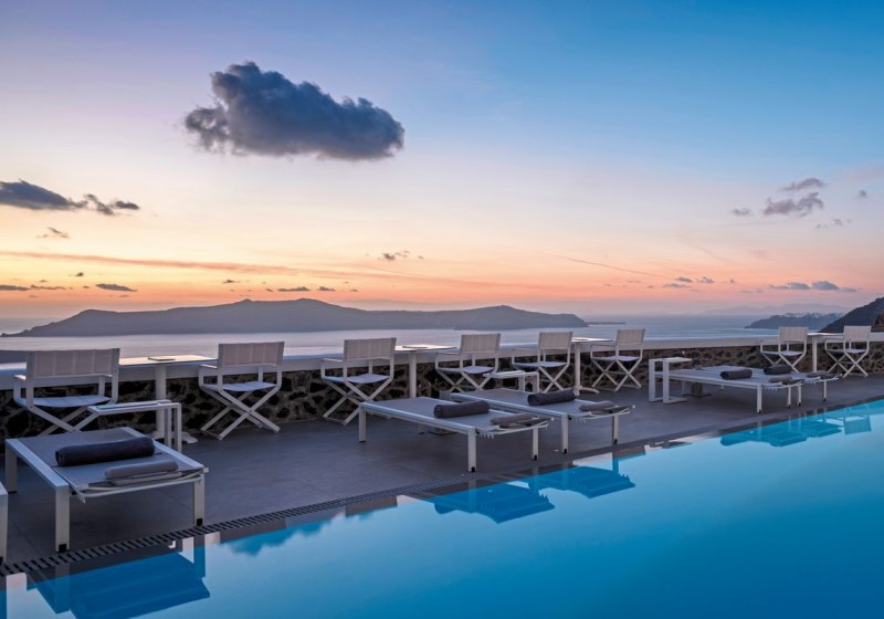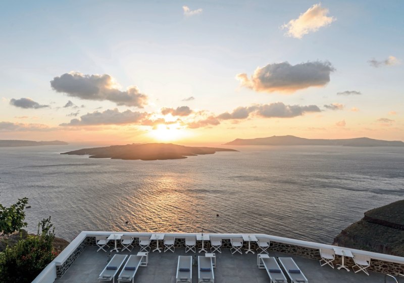 Dank der zentralen Lage in Fira bleibt Ihr variabel, ohne im Hotel selbst auf Trubel zu stoßen. So fühlt sich der Abend an: ein Blick über die Caldera, ein Platz an der Bar, Gespräche in überschaubiger Atmosphäre. Wer den Tag geruhsam ausklingen lassen möchte, findet auf den Terrassen und Balkonen einen stillen Rückzugsort mit Szene-Blick auf die Ägäis.