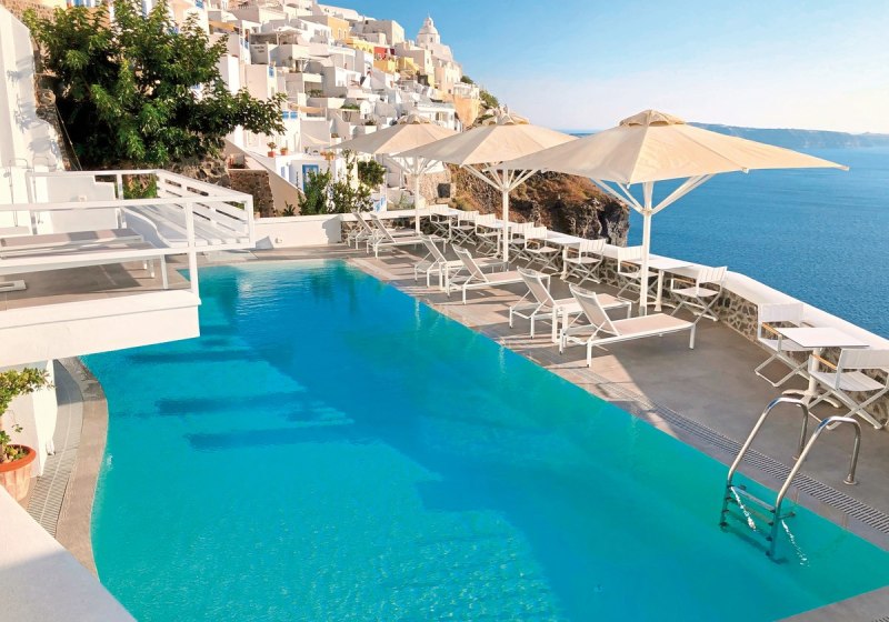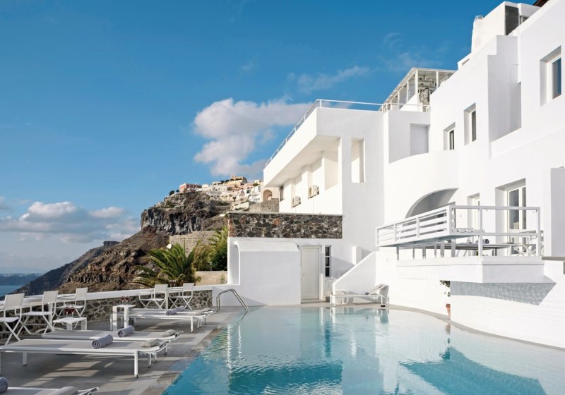 Wer Santorin mit Fokus auf Aussicht und kurze Wege erleben möchte, findet hier ein Haus ohne Umwege: wenige Einheiten, funktionale Bereiche, Pool mit Liegen und Schirmen, dazu Frühstücksraum, Poolbar und Bar. Ein Ort für konzentrierte Tage mit weitem Blick.