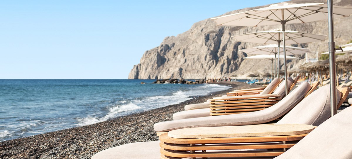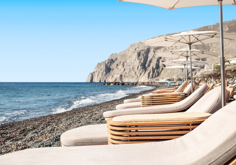 Ihr wohnt in Kamari, einem Ort mit markantem, schwarzen Lavastrand. Vom Radisson Blu Zaffron Resort, Santorini sind es etwa 300 Meter bis zum Strand, an dem Euch ein eigener Abschnitt erwartet. Die Lage ist als ruhig ausgewiesen – ideal, wenn Ihr Rückzug sucht und zugleich die Nähe zum Meer schätzt. Sonnenschirme sind am Strand vorgesehen.