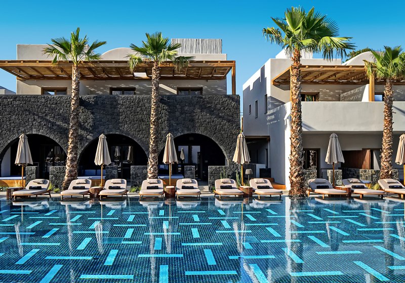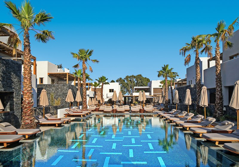 Radisson Blu Zaffron Resort, Santorini kombiniert ruhige Lage in Kamari mit kurzer Distanz zum schwarzen Lavastrand und eigenem Strandabschnitt. Adults-only ab 14 Jahren, klare Strukturen und verlässlicher Service prägen den Aufenthalt. Außenpool, Sonnenterrasse und Poolbar fügen sich zu einem stimmigen Ganzen.