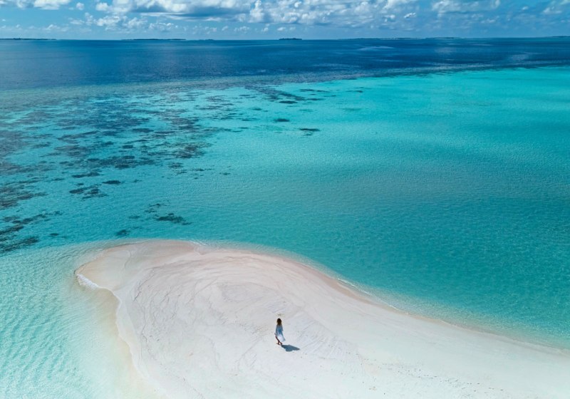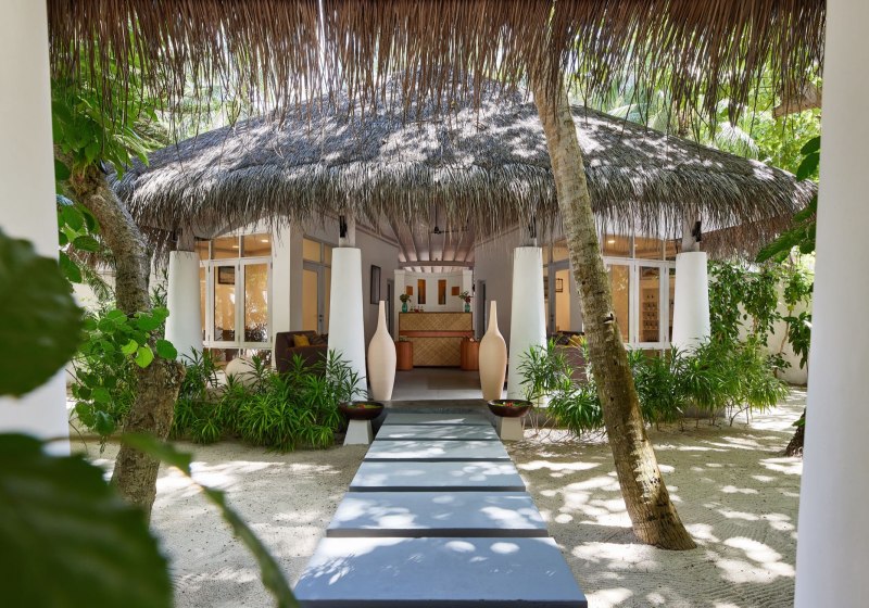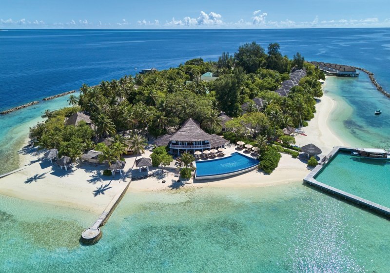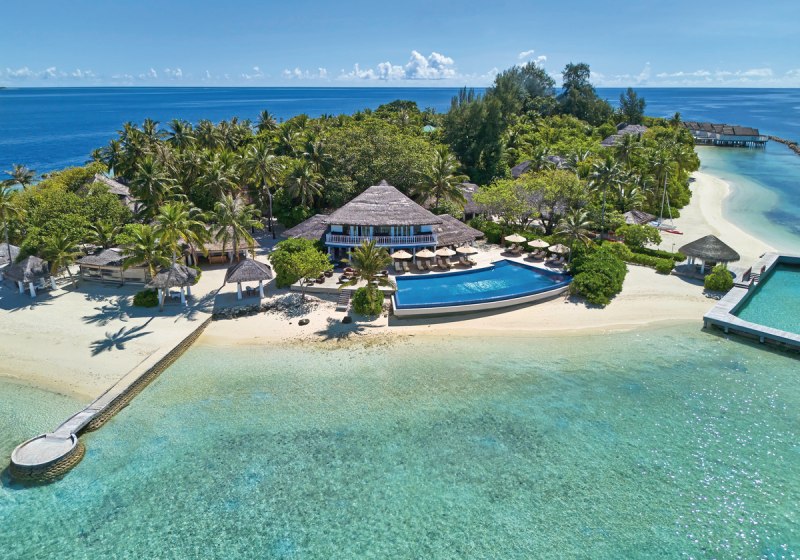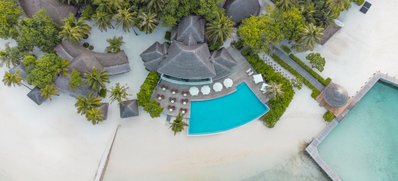 Die Lage im südlichen Ari-Atoll setzt klare Referenzen: Eine kleine Insel mit etwa 300 mal 130 Metern Fläche, ringsum Sandstrand und Lagune, dazu das Hausriff in greifbarer Nähe – je nach Abschnitt 20 bis 200 Meter vom Ufer. Die Anreise gelingt direkt per Wasserflugzeug in ungefähr 25 Minuten. Das vermittelt Euch ein Gefühl von Distanz zum Alltag ohne langwierige Transfers. Rund um die Insel strukturiert das Meer den Tag: Schnorcheln am Riff, Bootseinstieg für Wassersport, Wege von Villa zu Strand, Pool und Restaurants bleiben kurz und intuitiv. Die Atmosphäre ist maritim, komprimiert und unmittelbar – Ihr nehmt die Insel als zusammenhängenden Lebensraum wahr, in dem jedes Ziel nur wenige Schritte entfernt liegt.
