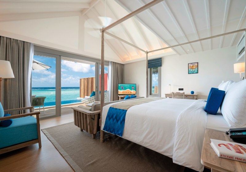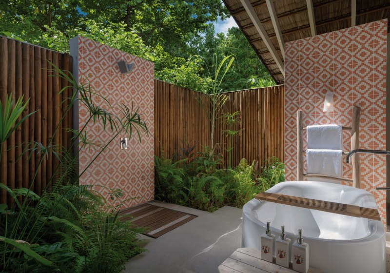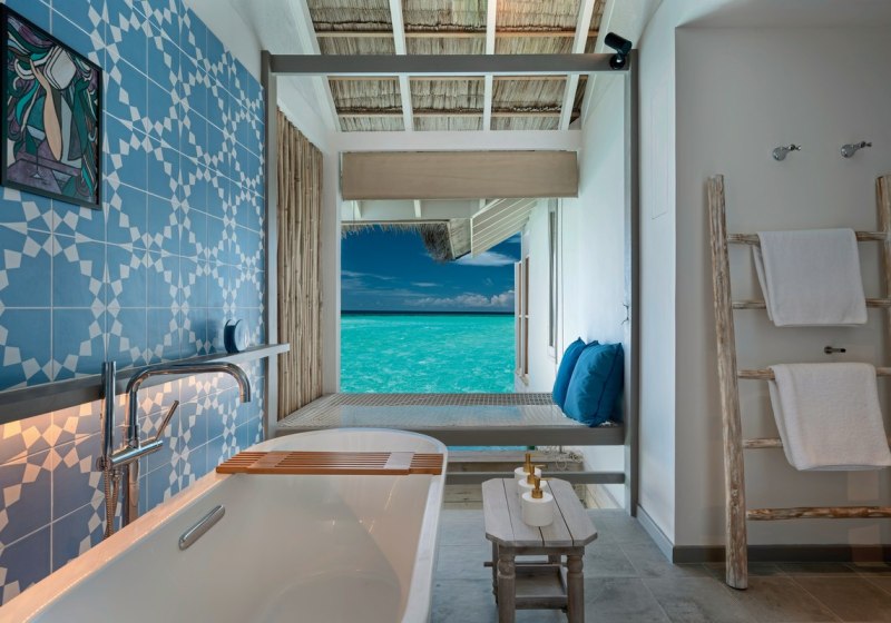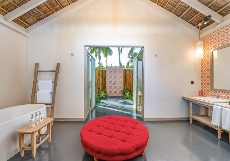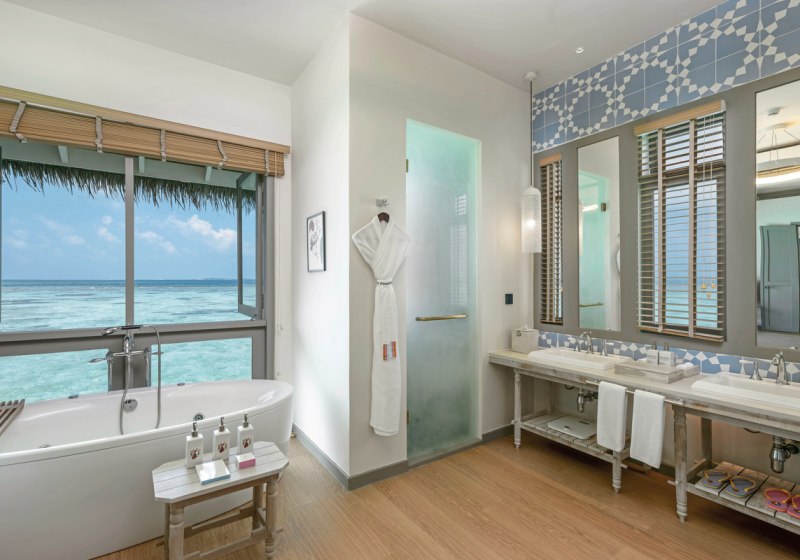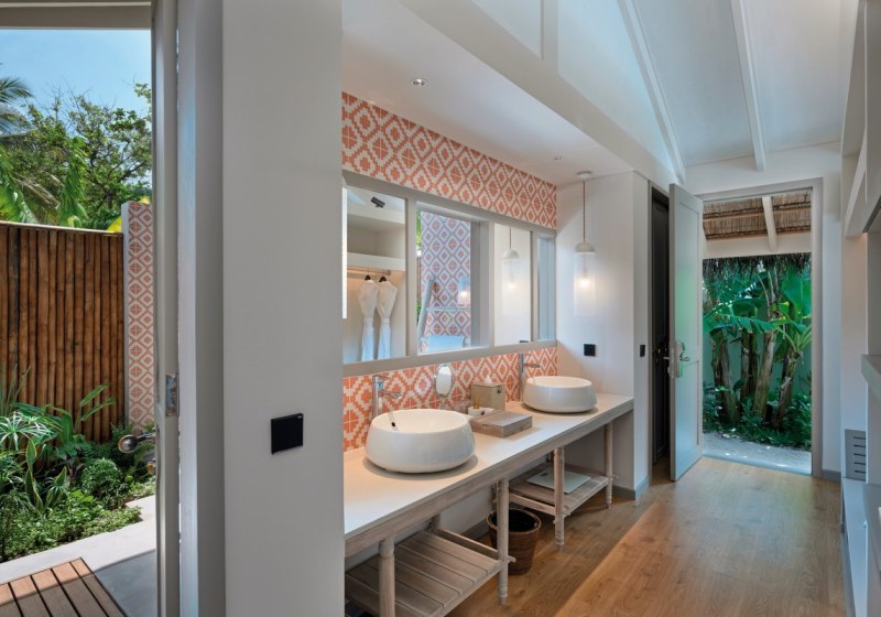 Die Lagoon Villen stehen auf Stelzen über dem Meer und bieten direkten Zugang zur Lagune. Sie verzichten bewusst auf eine Außendusche; im Bad hängt eine Hängematte für Momente über dem Wasser. Auch hier ist ein privater Pool optional. Das Setup ist klar: Beach für Sand unter den Füßen, Lagoon für Wasserblick und Steggefühl. Highlight: Zwei Villenwelten, präzise auf Strand- oder Lagunenfokus zugeschnitten.