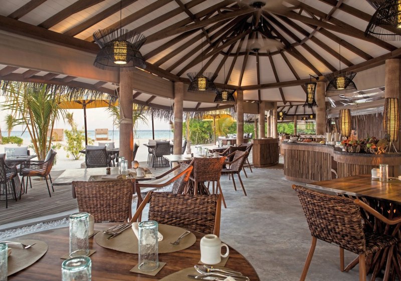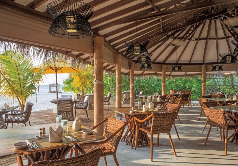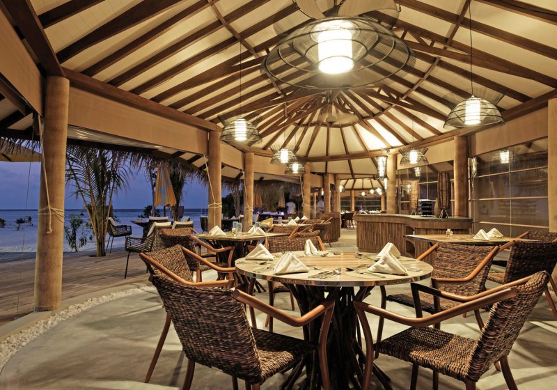 Im Open-Air-Restaurant esst Ihr internationale Küche mit Schwerpunkt auf Meeresfrüchten. Die Zubereitung bleibt klar und produktfokussiert, passend zum Inselsetting. An der Bar begleitet Ihr den Sonnenuntergang mit einem Drink und Blick auf die Lagune.