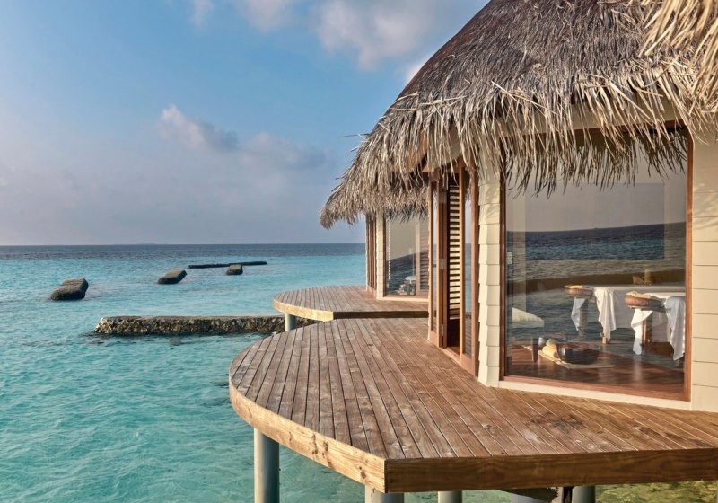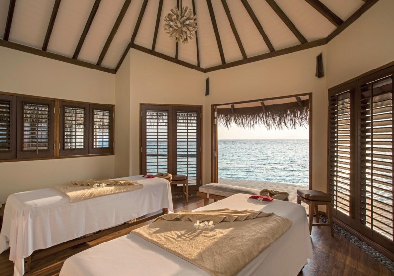 Das Spa steht auf Stelzen über dem Meer – Ihr blickt auf die Lagune, während Massagen und Anwendungen für tiefe Entspannung sorgen. Die Kulisse bleibt ruhig, die Behandlungsschwerpunkte klar definiert.
