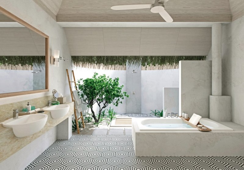 • Halboffenes Bad: Außendusche und Wanne verbinden Frischluft und Komfort überzeugend.