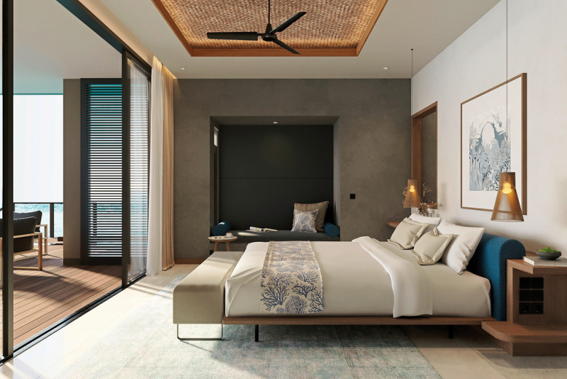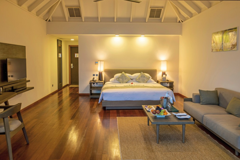 Die Villen und Zimmer sind großzügig und komfortabel ausgestattet. Alle Einheiten verfügen über eine Dusche/WC mit Regendusche, Bademäntel, CD-Player, DVD-Player, Deckenventilator, Föhn, Kaffee-/Teezubereiter, Sitzecke, TV, Telefon, iPod-Docking-Station, WLAN, Safe, Minibar, Klimaanlage und ein Kingsize-Bett. Die Water Villas liegen auf Stelzen über dem Wasser und verfügen über einen Terrassenbereich mit direktem Zugang zum Meer.