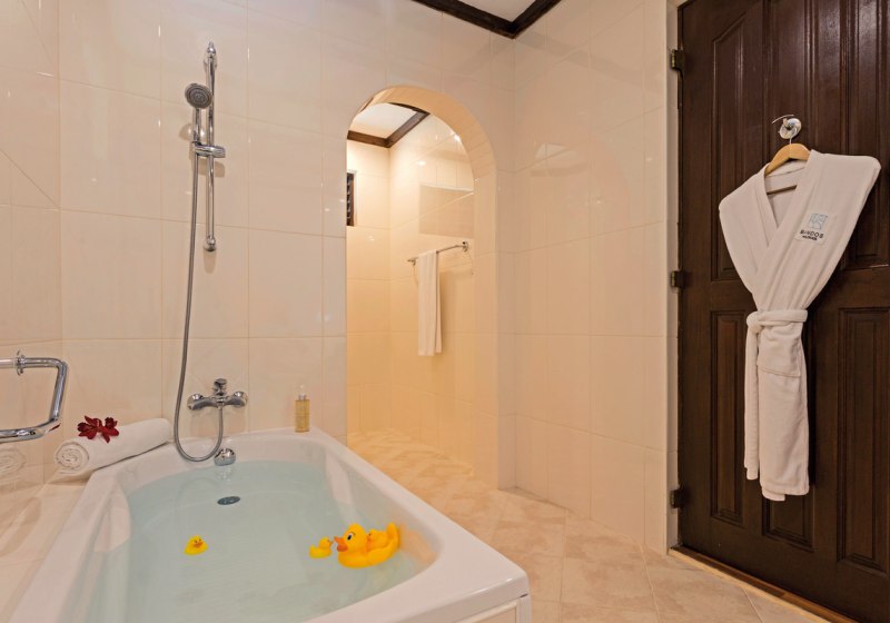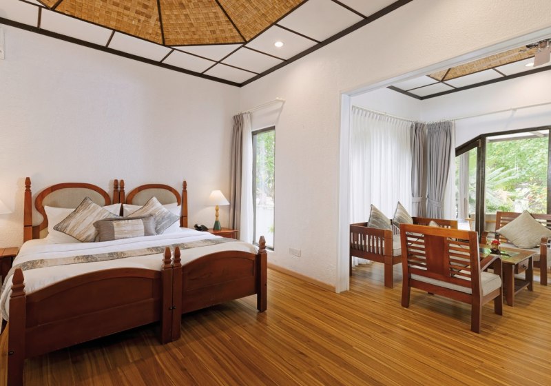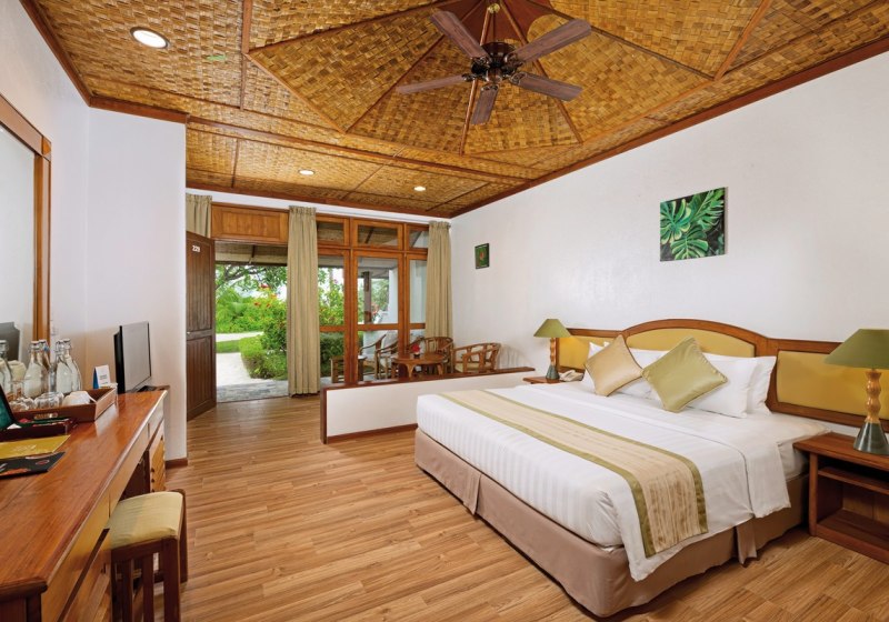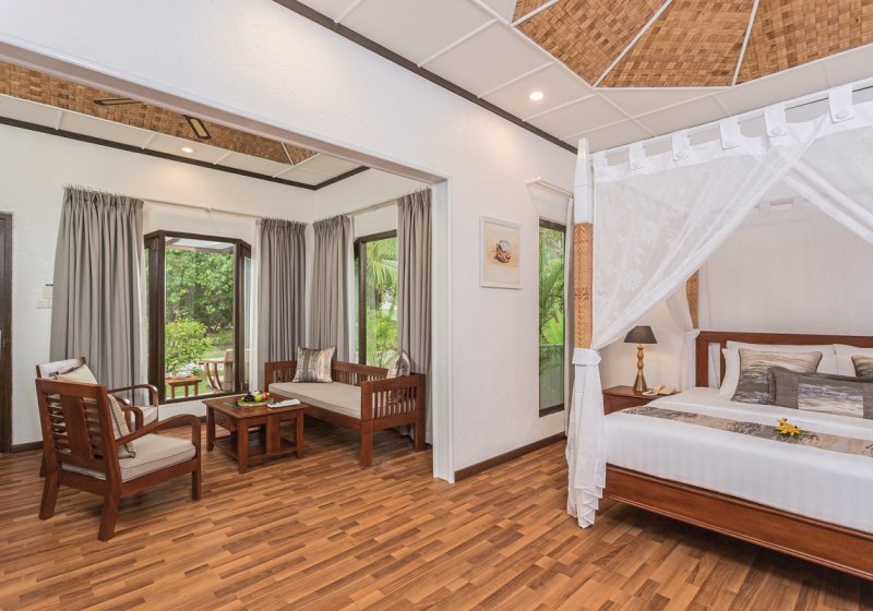 Eure Unterkunft ist klar ausgestattet: Dusche/WC, Föhn, Klimaanlage, Telefon, Safe, Sat-TV, Minibar sowie Kaffee-/Teezubereiter gehören zur Basis, ergänzt um Terrasse oder Balkon. Wer kompakt wohnen mag, wählt Beachfront Doppelzimmer mit etwa 38 Quadratmetern; mehr Raum bieten Deluxe Beachfront Zimmer mit circa 54 Quadratmetern, Badewanne und Deckenventilator.