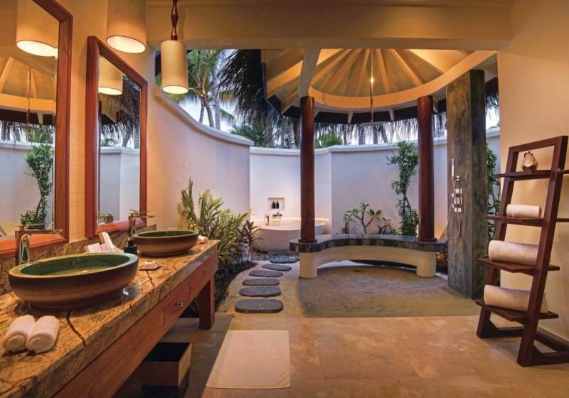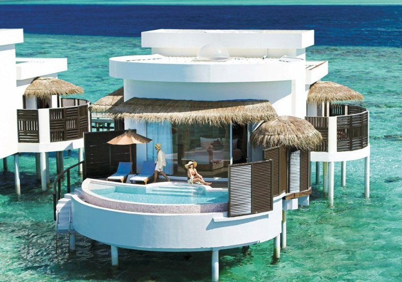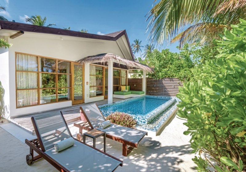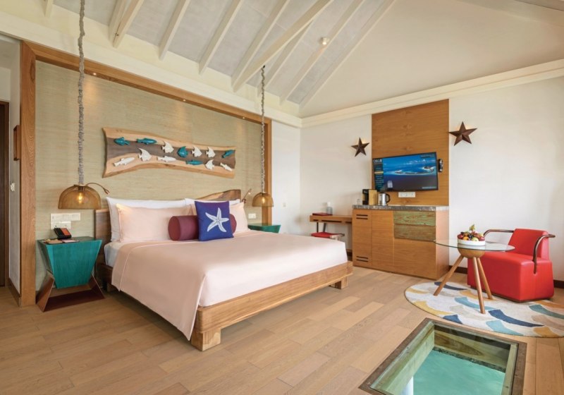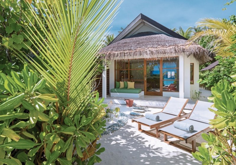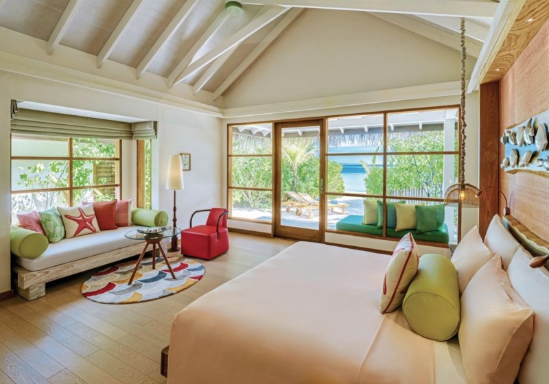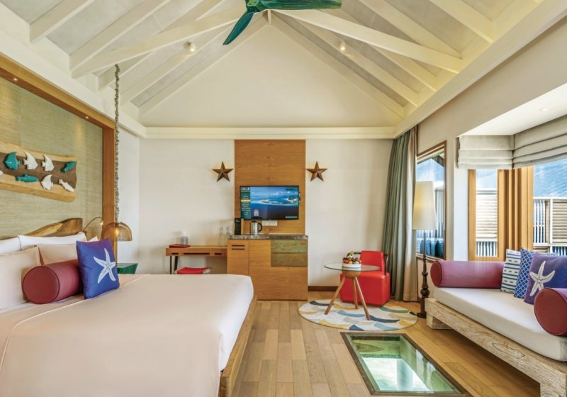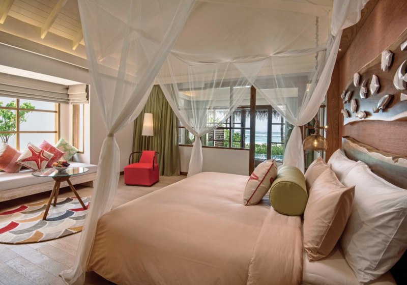 Ihr residiert in freistehenden Villen am Strand oder über der Lagune mit etwa 71 bis 200 Quadratmetern. Klimaanlage und Ventilator, TV, WLAN, Safe sowie Minibar gehören zur Grundausstattung. Wasserkocher für Kaffee und Tee, Bügelbrett, Bügeleisen, Haartrockner und DVD-Player runden den Komfort ab.