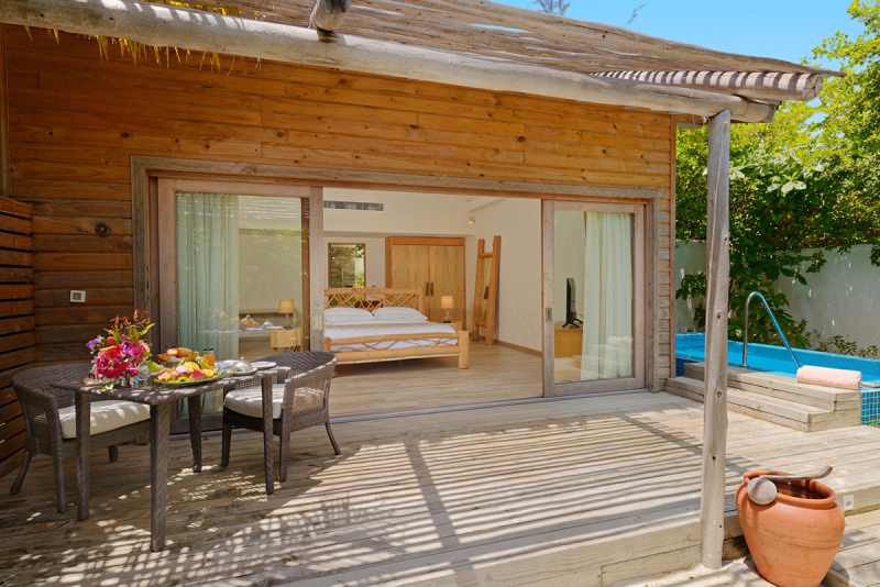 Sämtliche Zimmer und Suiten des Hotels sind luxuriös und rustikal eingerichtet, verfügen über eine Terrasse und sind teilweise mit einem privaten Pool ausgestattet. Alle Zimmer bieten einen Zugang zur Lagune oder zum Strand und sind mit Klimaanlage, Kaffee-/Teezubereiter und einem Flachbild-TV ausgestattet.