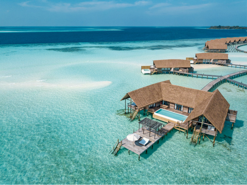 Ihr residiert in 34 Überwasservillen mit Größen von etwa 75 bis 123 m². Das Interieur ist auf Funktionalität und Ruhe ausgerichtet: Bad mit Badewanne und separater Dusche, Föhn, Klimaanlage, Safe und Sat‑TV. Eine Bose Soundbar, Telefon sowie Tee‑/Kaffeezubereiter runden die Ausstattung ab.