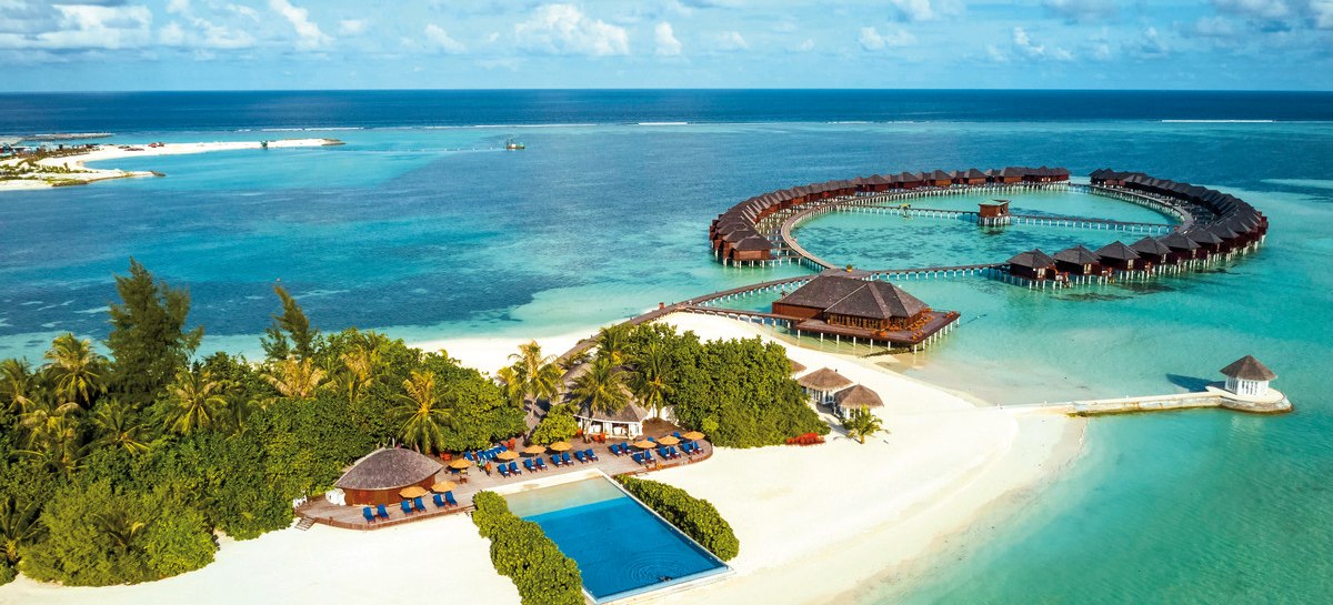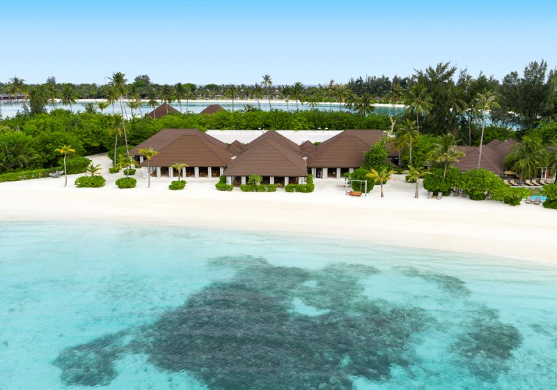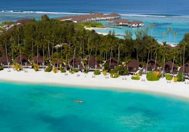 Das Resort liegt im Süd-Male-Atoll direkt am Außenriff – eine Lage, die Nähe zur offenen See und klare Sichtachsen auf die Lagune vereint. Zwei Inseln strukturieren den Aufenthalt: die größere Hauptinsel und die intimere Dream Island, verbunden durch eine Brücke. Der Transfer vom Flughafen Malé erfolgt per Speedboat in etwa 45 Minuten.