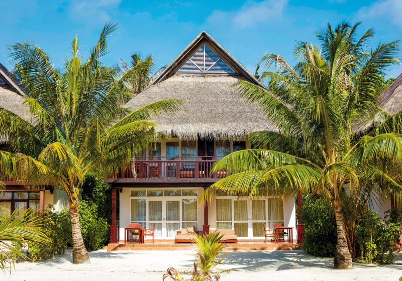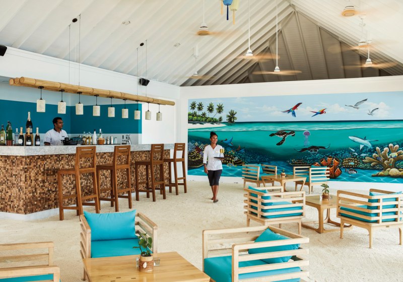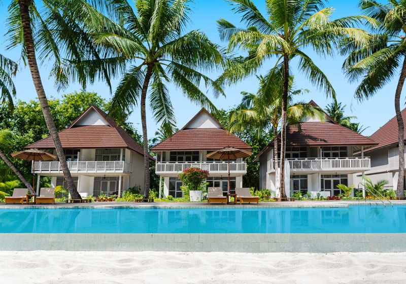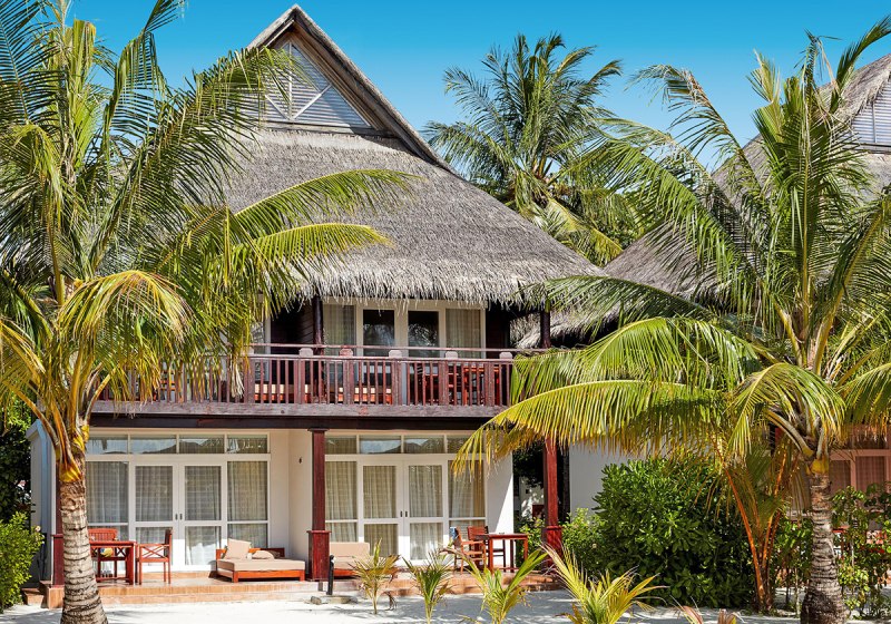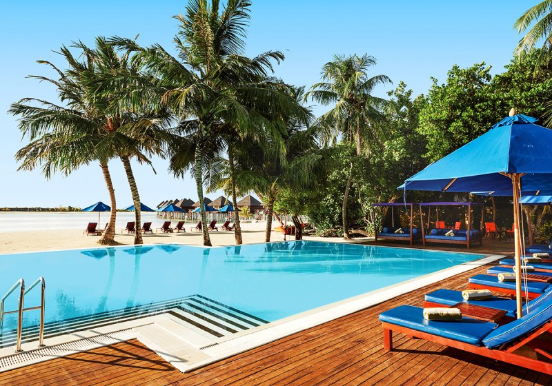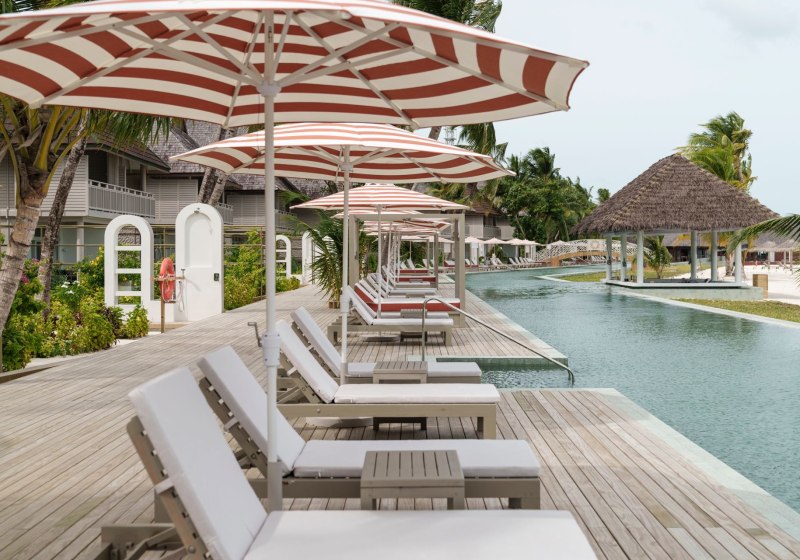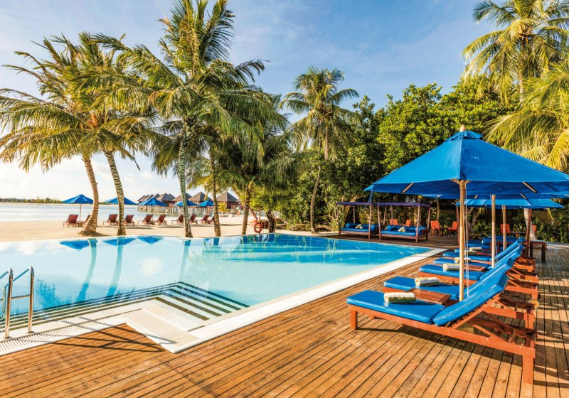 Mit 376 Villen und Suiten, sechs Pools inklusive Adults-Only-Bereich sowie zwei Spas – eines davon über dem Wasser – richtet sich das Resort an Paare, Freundesgruppen und Familien, die Struktur und Vielfalt schätzen. Kinder toben im Maakanaa Kids Club (3–12 Jahre) oder im Kinderpool, während Ihr an den Pools auf Liegen mit Badetüchern und Sonnenschirmen entspannen könnt. Die Atmosphäre wirkt zugleich lebendig und geordnet: Tageszeiten gliedern sich zwischen Strandmomenten, Fitness, Tennis oder Billard und abendlicher Unterhaltung mit Live-Band, Disco-Abenden, maledivischen Kulturnächten und Karaoke.