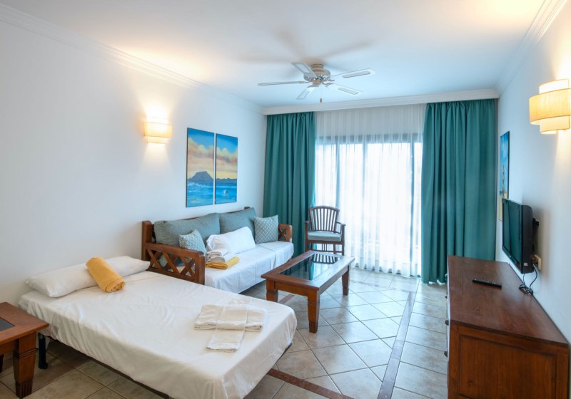 Ihr wohnt in Appartements mit ein oder zwei Schlafzimmern. Das 1‑Schlafzimmer‑Appartement bietet ca. 40 m², dazu einen Wohn-/Schlafraum mit Essbereich. Die Kitchenette ist mit Mikrowelle, Toaster, Kaffeemaschine und Wasserkocher ausgestattet – ideal, um Frühstück oder kleine Gerichte selbst zuzubereiten. Sat‑TV ist gratis, ein Telefon steht bereit; Wertsachen lagern im Mietsafe. Für Luftzirkulation sorgt ein Deckenventilator.