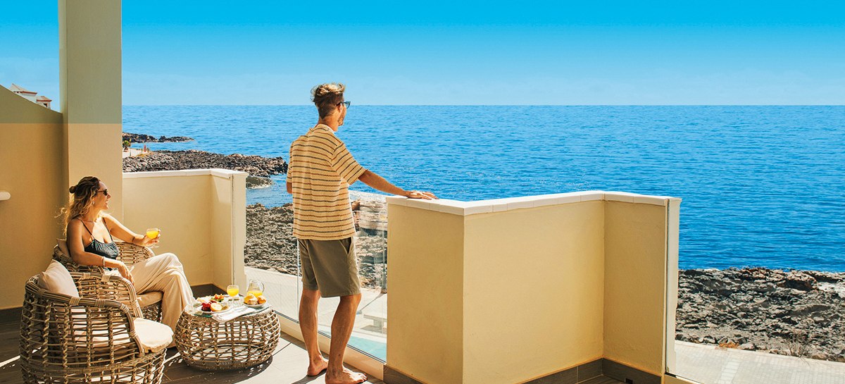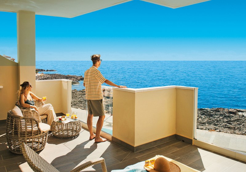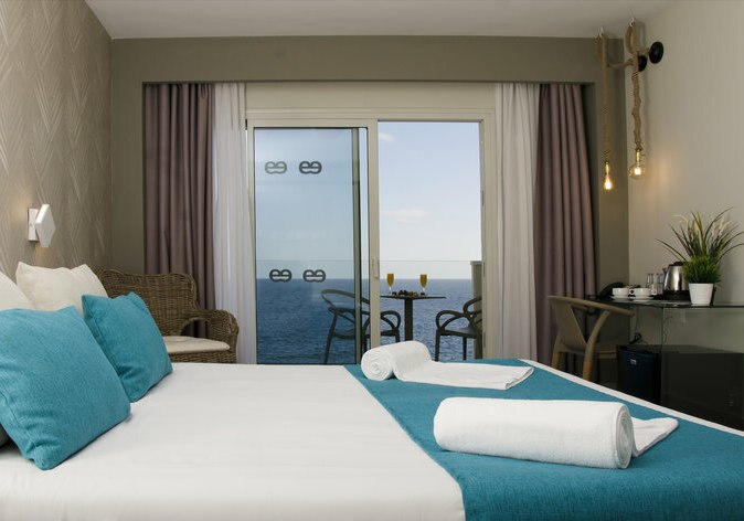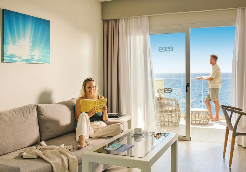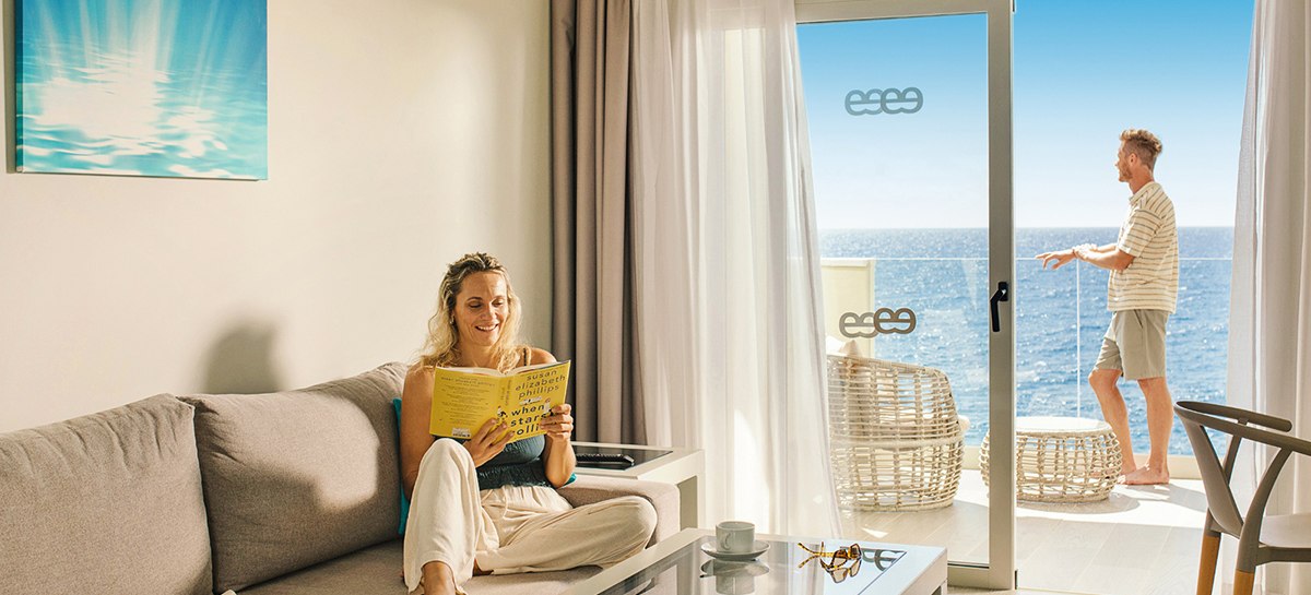 Mehr Raum bietet die Juniorsuite mit rund 56 Quadratmetern und separatem Schlafzimmer. Eine Kitchenette unterstützt unabhängige Tagesabläufe; der Balkon öffnet den Blick direkt zum Meer. Mit Klimaanlage, WLAN und TV bleibt der Komfort konsistent. Wer Wert auf Fläche und Aussicht legt, findet hier die passende Kategorie. Highlight: Juniorsuite mit separatem Schlafzimmer und direktem Meerblick.
