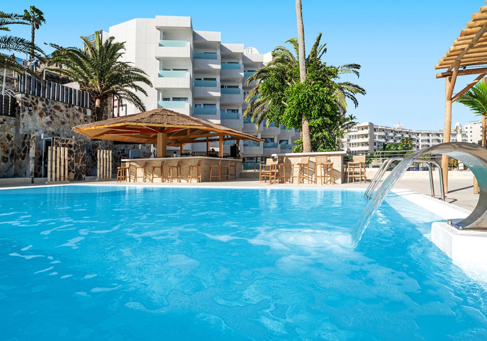 Das Hotel steht an der Südküste von Gran Canaria in der Nähe des Touristen-Hotspots Playa del Ingles. Die Anlage ist von einem üppigen tropischen Palmengarten eingerahmt, der abends ansprechend illuminiert wird. Das Hotel steht am Playa de las Burras, einem Nachbarstrand des berühmten Playa del Ingles. Das große Hotelrestaurant „Las Palmeras“ bietet zu den Hauptmahlzeiten Buffets mit internationalen Gerichten an. Das Restaurant hat eine große überdachte Terrasse, auf der regelmäßig Themenabende und Showcooking veranstaltet werden. An der Poolbar werden mittags auch À-la-carte-Gerichte als Menü serviert. Neben Tischtennis, Boccia, Minigolf oder Tennis werden verschiedene Wassersportarten angeboten. Für Kinder steht ein großer Spielplatz bereit. Das Hotel bietet sowohl Tagesanimation als auch Abendevents und Disconächte für Erwachsene. Die kleineren Kinder werden im Miniclub betreut, für Teenager gibt es ein eigenes Animationsprogramm. Im Zentrum des Hotelgartens steht ein großer Pool, der in den kalten Monaten beheizt wird. Der Zugang zum Strand erfolgt über eine kleine Treppe am Rand des Grundstücks. Im Wellnessbereich erwarten die Gäste Sauna, Solarium und Dampfbad sowie ein Massagesalon.