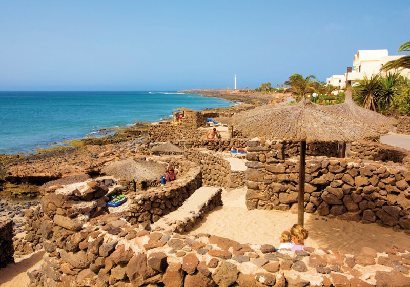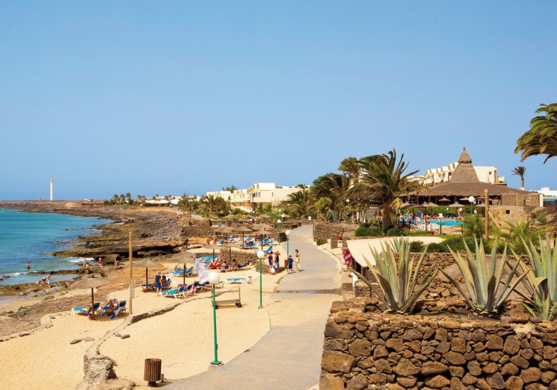 Die öffentlichen Bereiche sind übersichtlich organisiert: Rezeption, Shop/Boutique und Bars liegen zentral, Wege zum beheizbaren Süßwasserpool sind kurz. WLAN nutzt Ihr kostenfrei in der gesamten Anlage. Sonnenliegen und Schirme stehen am Pool und am Strand bereit, Badetücher erhaltet Ihr gegen Kaution. Mit 220 Nichtraucherzimmern und Suiten bleibt das Haus überschaubar, ohne beengt zu wirken. Highlight: Direkte Felsküstenlage mit Naturstrand und freiem Blick auf Fuerteventura.