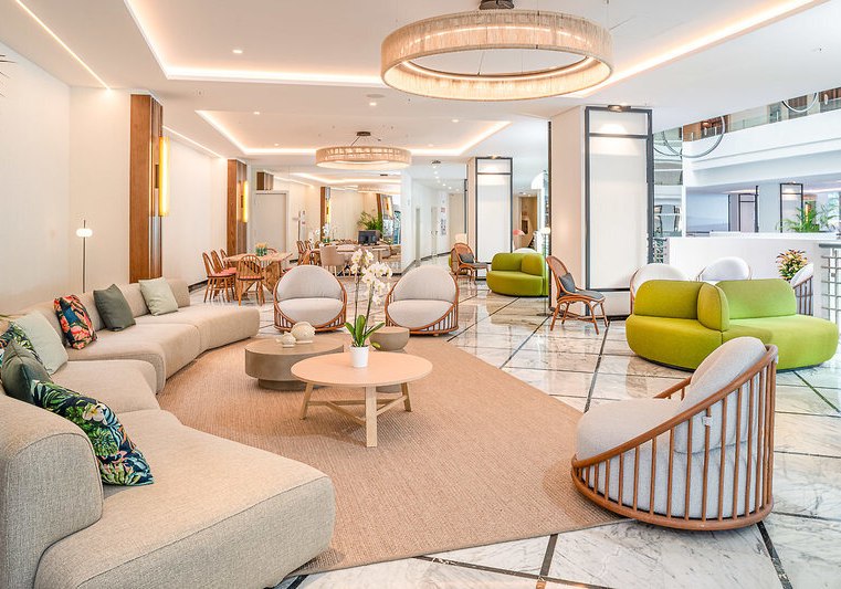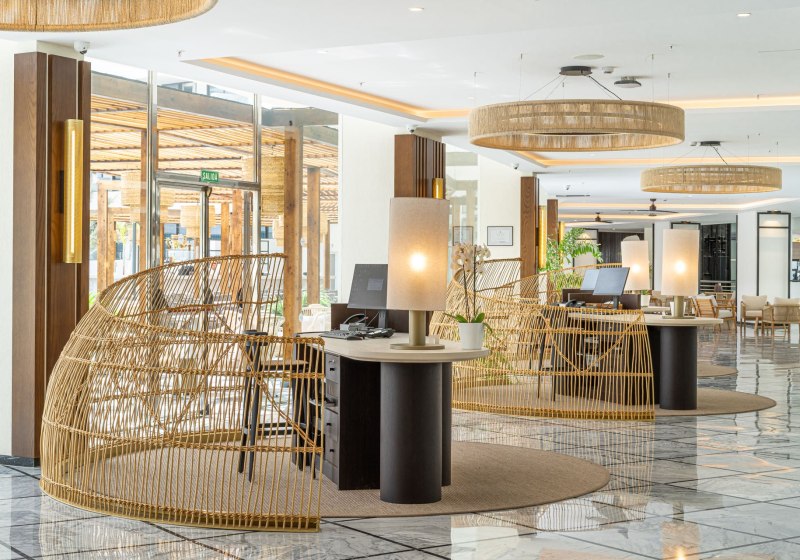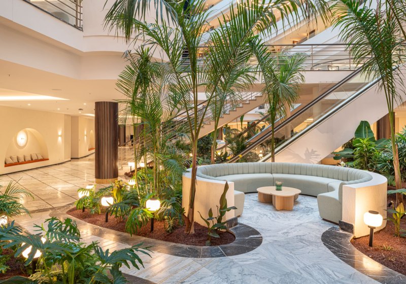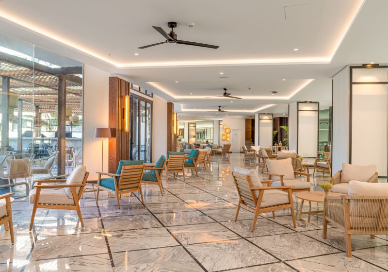 Die große Empfangshalle mit 24-Stunden-Rezeption führt in weitläufige Bereiche mit Außenpool, Kinderbecken und Splash Pool. Sonnenterrasse, Gartenflächen und Terrassen schaffen luftige Wege zwischen Poolbar, Boutique/Cafeteria und den Sitzbereichen mit WLAN – in Zimmern und öffentlichen Zonen inklusive.