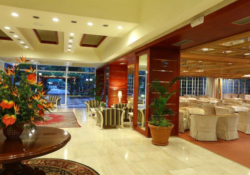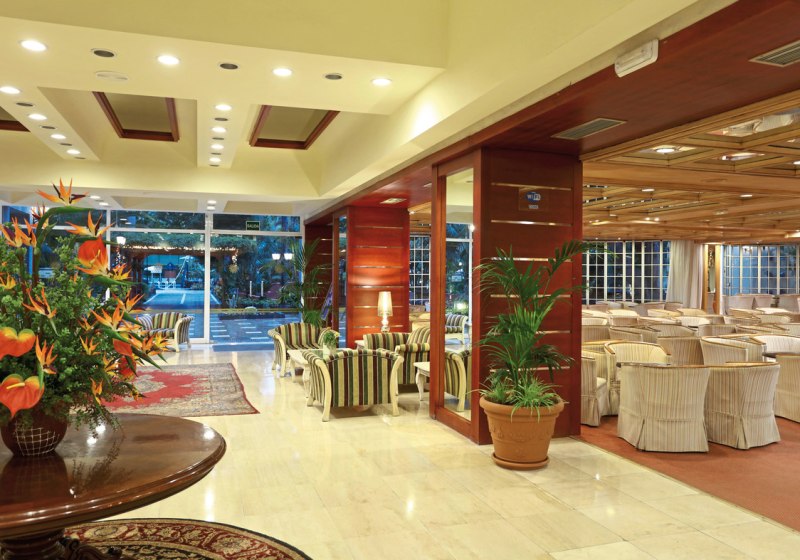 Die Infrastruktur ist umfassend: Empfangshalle, drei Aufzüge und ein Konferenzsaal strukturieren den Innenbereich. Im Außenbereich breitet sich eine große Gartenanlage mit zwei beheizten Süßwasserpools, Kinderbecken und Sonnenterrassen aus; Liegen und Sonnenschirme sind vorhanden, Poolhandtücher erhaltet Ihr gegen Kaution. Ein Friseur befindet sich im Haus.