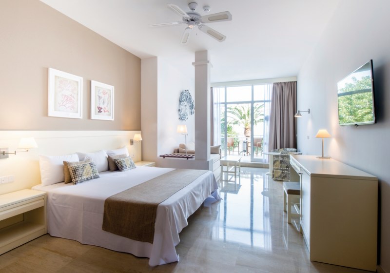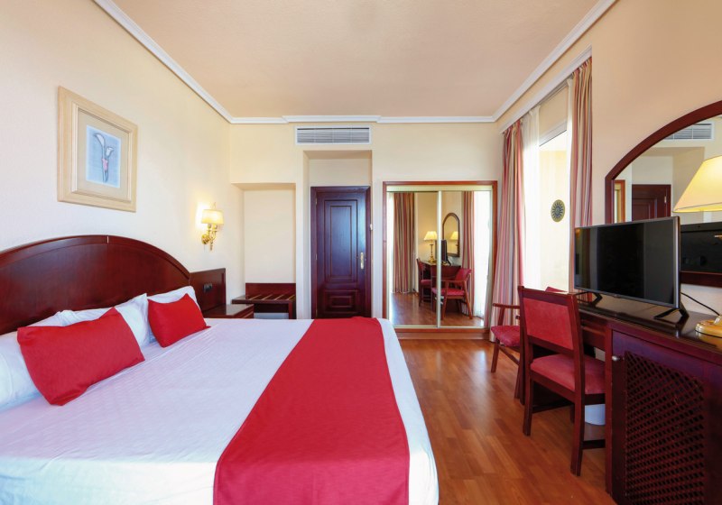 Ihr wählt zwischen Doppelzimmern mit etwa 19–26 Quadratmetern und Juniorsuiten mit rund 40 Quadratmetern. Alle Zimmer bieten Bad/WC, Haartrockner, Klimaanlage, Sat‑TV, Telefon, Mietsafe, Minibar gegen Gebühr und einen Balkon. Bei den Betten stehen zwei Einzelbetten oder ein Kingsize‑Bett zur Verfügung.
