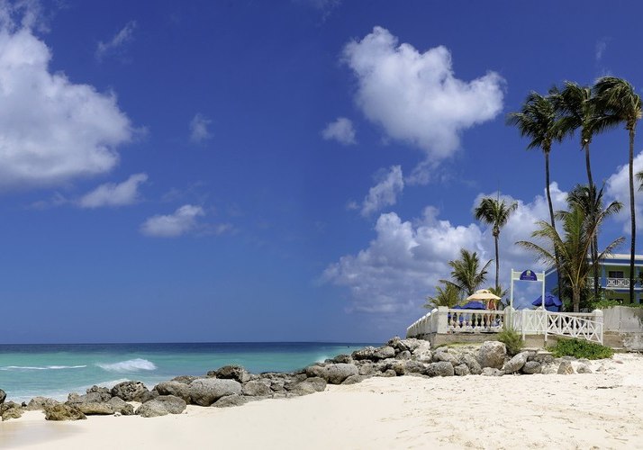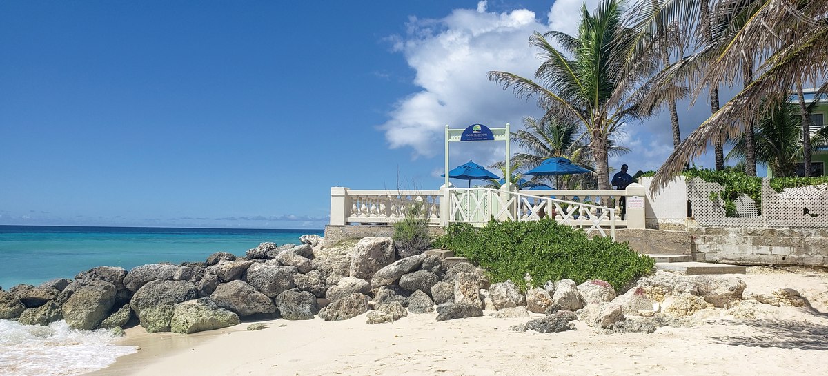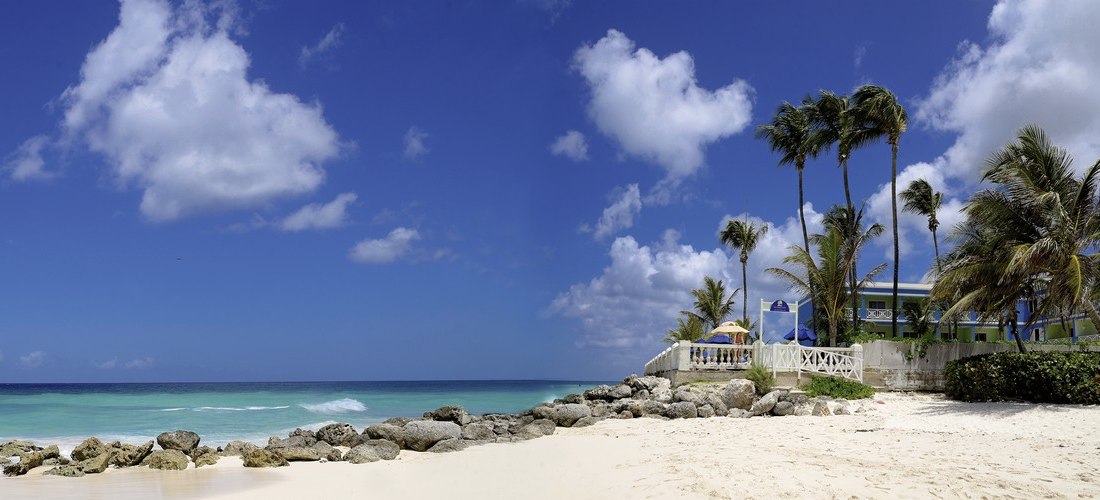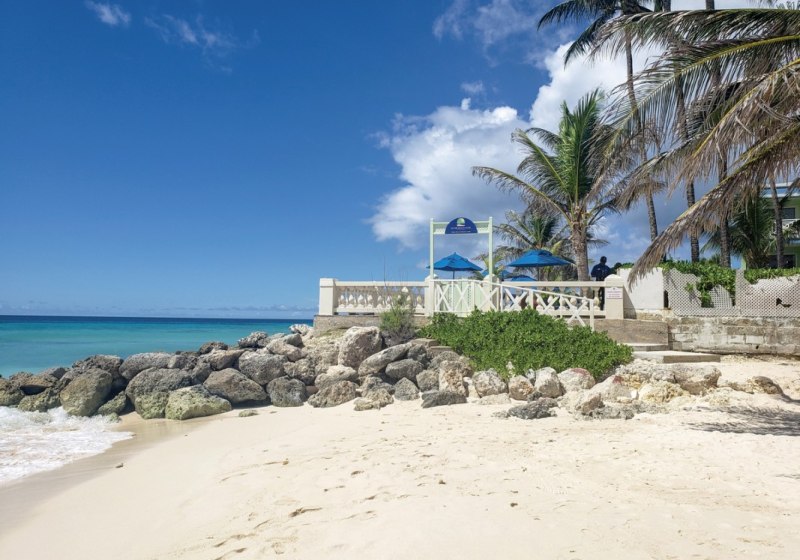 Dover Beach, Barbados: Hier wohnt Ihr direkt am Sandstrand mit unmittelbarem Zugang zum Wasser. Bis Bridgetown sind es etwa 6 km, zum Flughafen rund 4 km – ideale Distanzen für kurze Transfers und spontane Ausflüge. Die Stimmung am Strand ist präsent, während Garten und Pools eine ruhigere Alternative bieten.