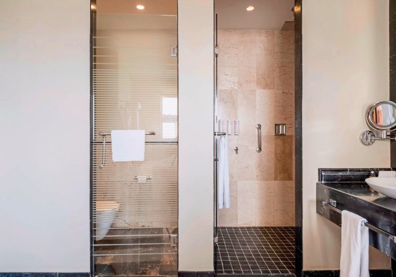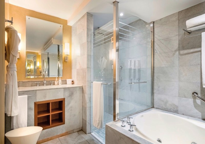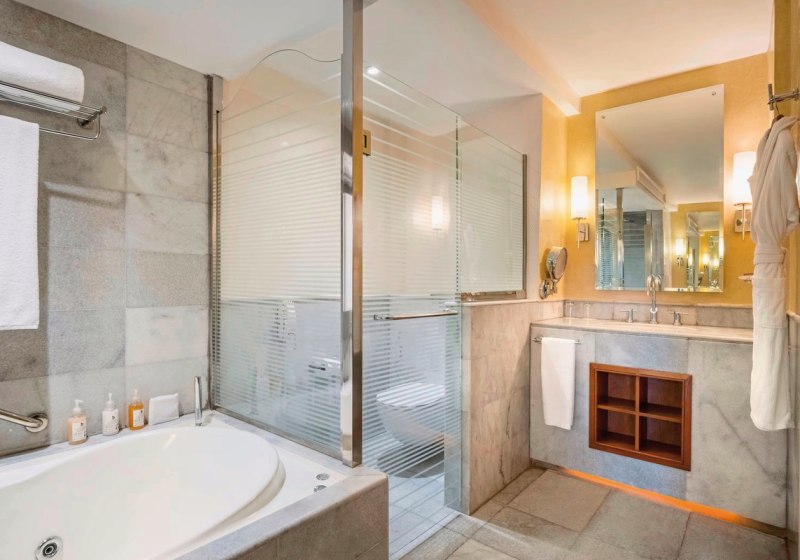 Die Zimmer kombinieren Funktion und Rückzug: Klimaanlage, Ventilator, WLAN, Safe und TV stehen bereit, ebenso eine Sitzecke sowie Balkon oder Terrasse mit Außenmöbeln. Badezimmer bieten Dusche und WC, oft ergänzt um Hydromassage-Badewanne; Bademantel, Slipper, Föhn und Vergrößerungsspiegel erweitern den Komfort.