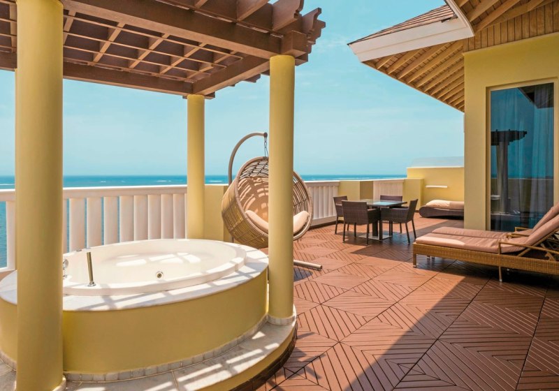 Beim Schlafen wählt Ihr meist zwischen zwei Queensize-Betten (ca. 1,40 x 2 m) oder Kingsize-Variante, je nach Kategorie. Minibar, Kaffee-/Teezubereiter, Bügelset, Schreibtisch und Gute-Nacht-Service strukturieren den Tagesrhythmus. In ausgewählten Kategorien gehört Meerblick dazu; teils sind zusätzliche Ausstattungen wie Küche vorgesehen. Der Fliesenboden sorgt für klare Linien. Highlight: Geräumige Zimmer mit Hydromassage-Badewanne und optionalem Meerblick.