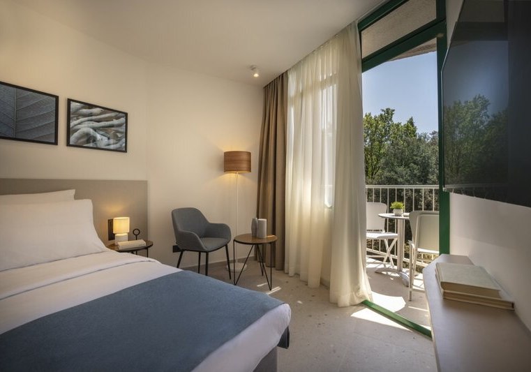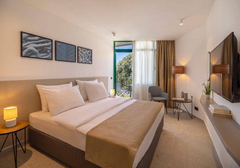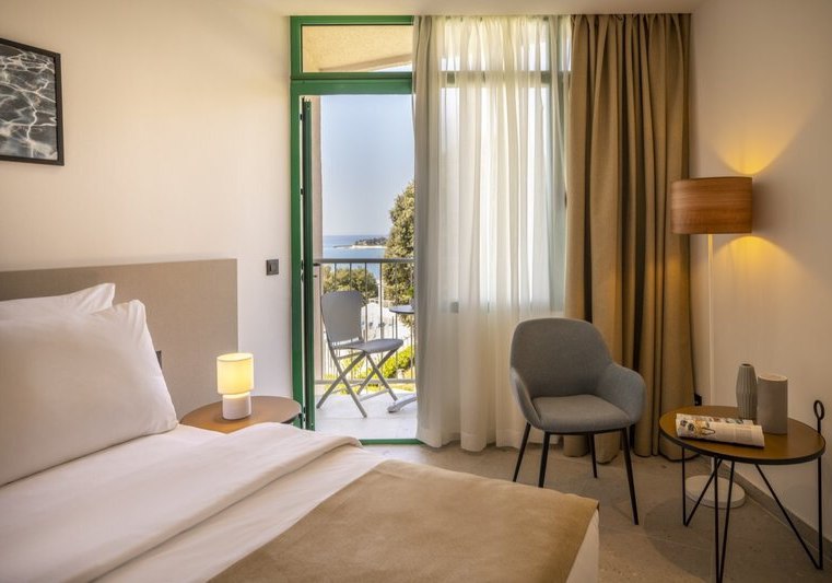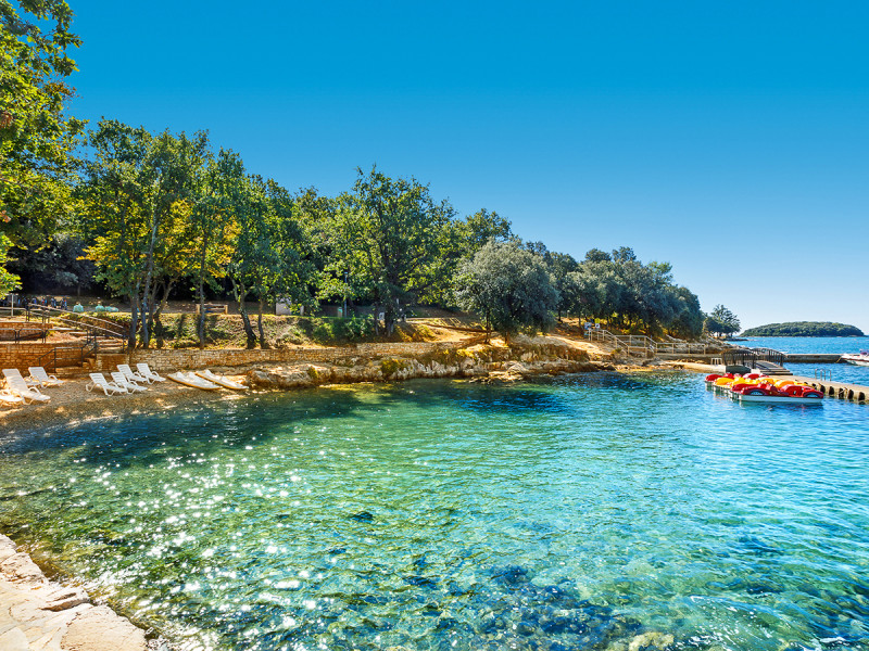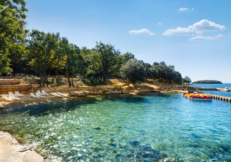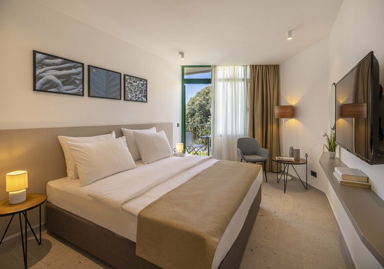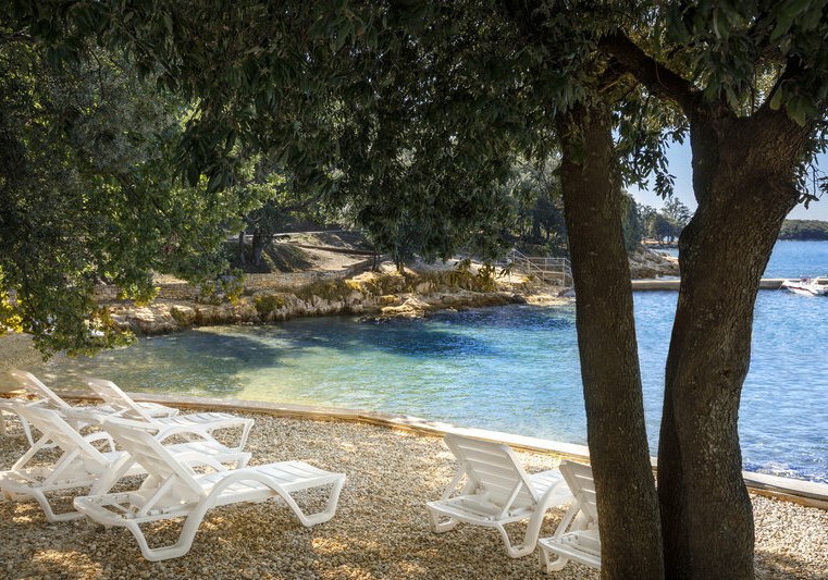 Ihr wohnt in Funtana an der Felsküste, nur 20 bis 100 Meter vom Strand entfernt und rund 300 Meter vom Ortszentrum. Die Nähe zu Vrsar erweitert Eure Spaziergänge, während der Küstencharakter mit Steinen und Plateaus das Bild prägt. Kurze Wege bestimmen den Alltag: vom Zimmer zur Terrasse, vom Gartenpfad ans Wasser, vom Pool zur Bar – geradlinig und übersichtlich.