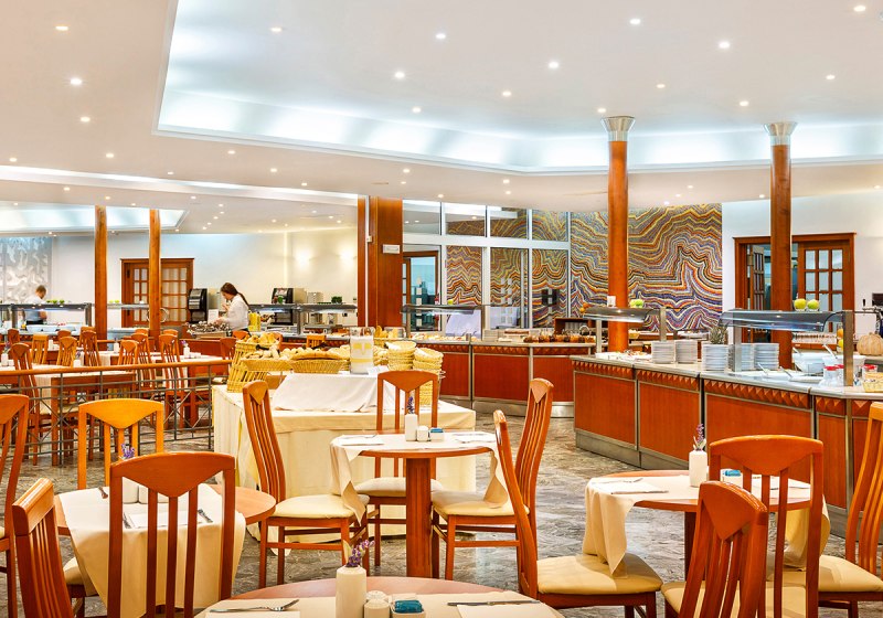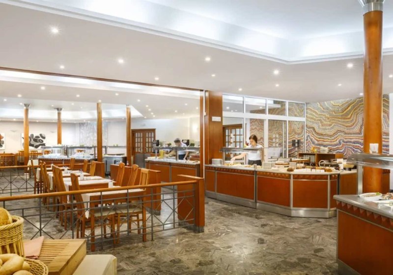 Die Anlage ist funktional und weitläufig genug für klare Wege: Empfangshalle mit 24-Stunden-Rezeption, WLAN in der gesamten Anlage, Garten- und Terrassenbereiche, Sonnenterrasse und Poolareal mit Liegen und Schirmen. Eine Poolbar, Café, Snackbar und Speiseräume verteilen die gastronomischen Punkte sinnvoll.
