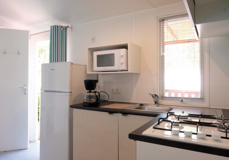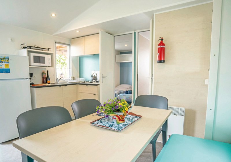• Mobilheim-Komfort: 26–30 qm, Klimaanlage, Kochnische und Essecke für flexible Tage.