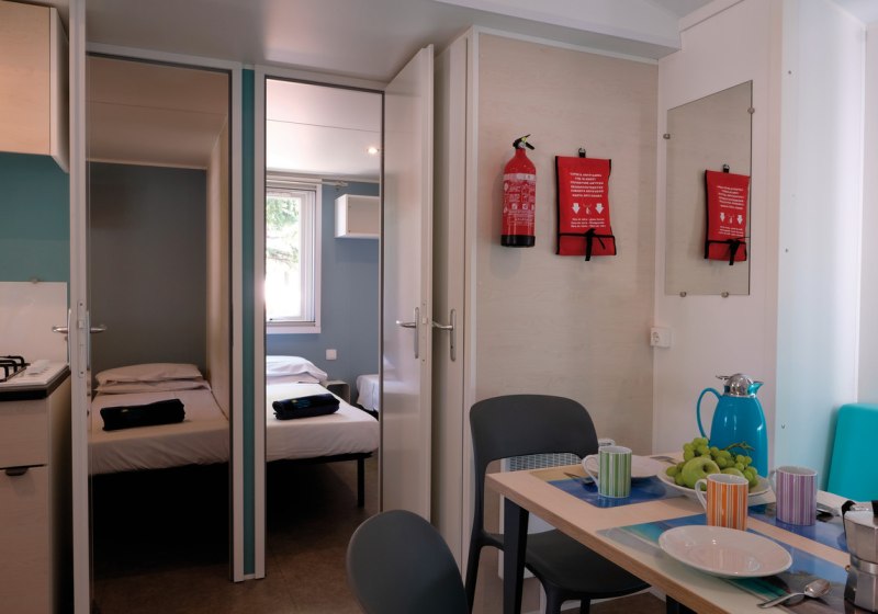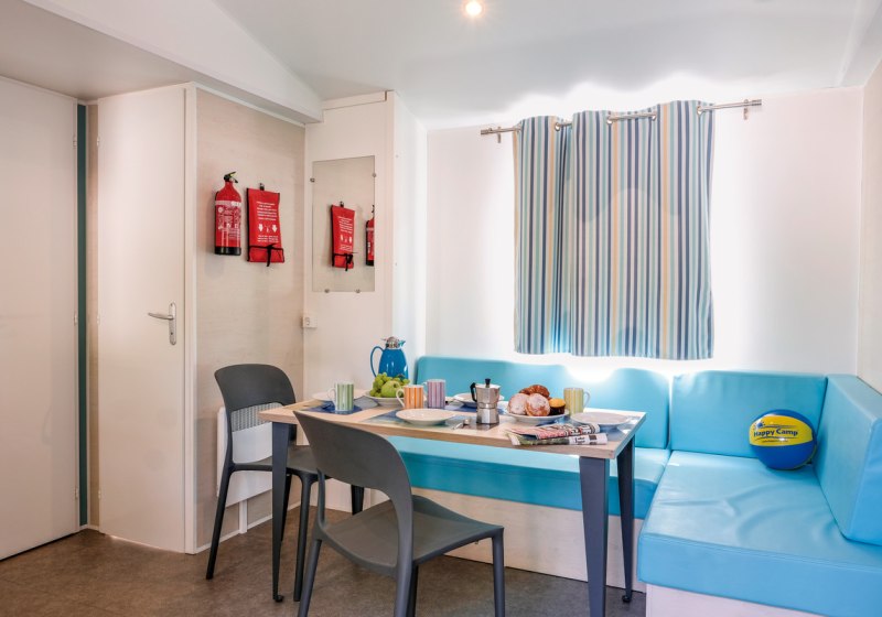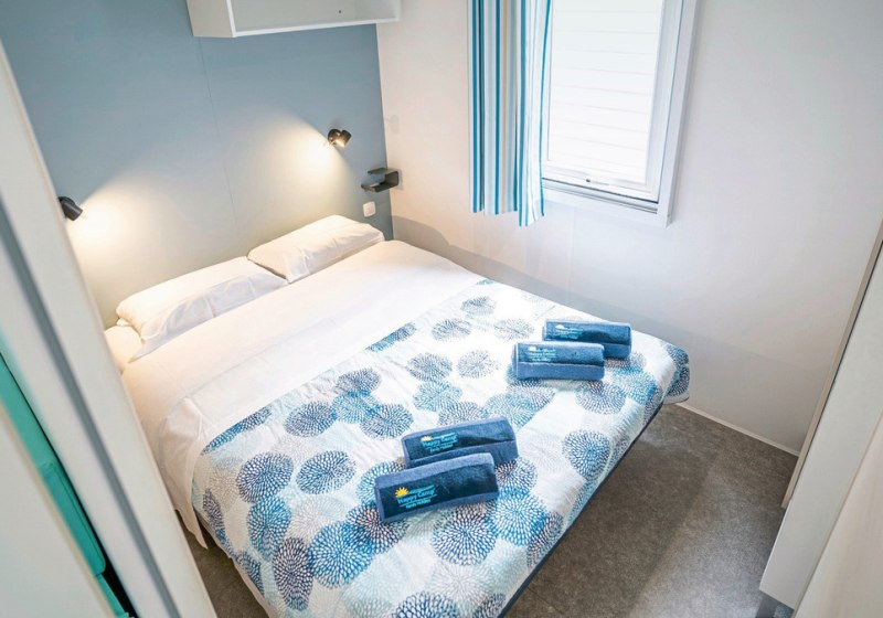 Ihr wohnt in Mobilheimen mit 26–30 Quadratmetern, drei separaten Schlafzimmern und einem Wohn-/Schlafraum mit Sitzbank als zusätzlicher Schlafmöglichkeit. Die Kochnische mit Essecke, Dusche/WC und eine Klimaanlage stellen Komfort und Funktion in den Vordergrund.