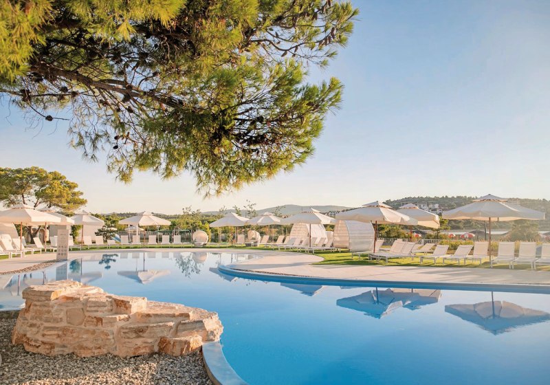 Die Atmosphäre wirkt unkompliziert und klar strukturiert: kurze Distanzen, viele Optionen, alles auf gemeinsame Zeit ausgelegt. Am Pool wartet die Sonnenterrasse mit Liegen und Schirmen, am Strand beginnt der Tag barfuß. Kulinarisch wechselt Ihr zwischen Hauptrestaurant, À-la-carte-Adressen, Patisserie und dem dalmatinischen Dorf als eigenem Genussbereich. Haustiere sind nicht erlaubt, Babybetten sind auf Anfrage verfügbar.
